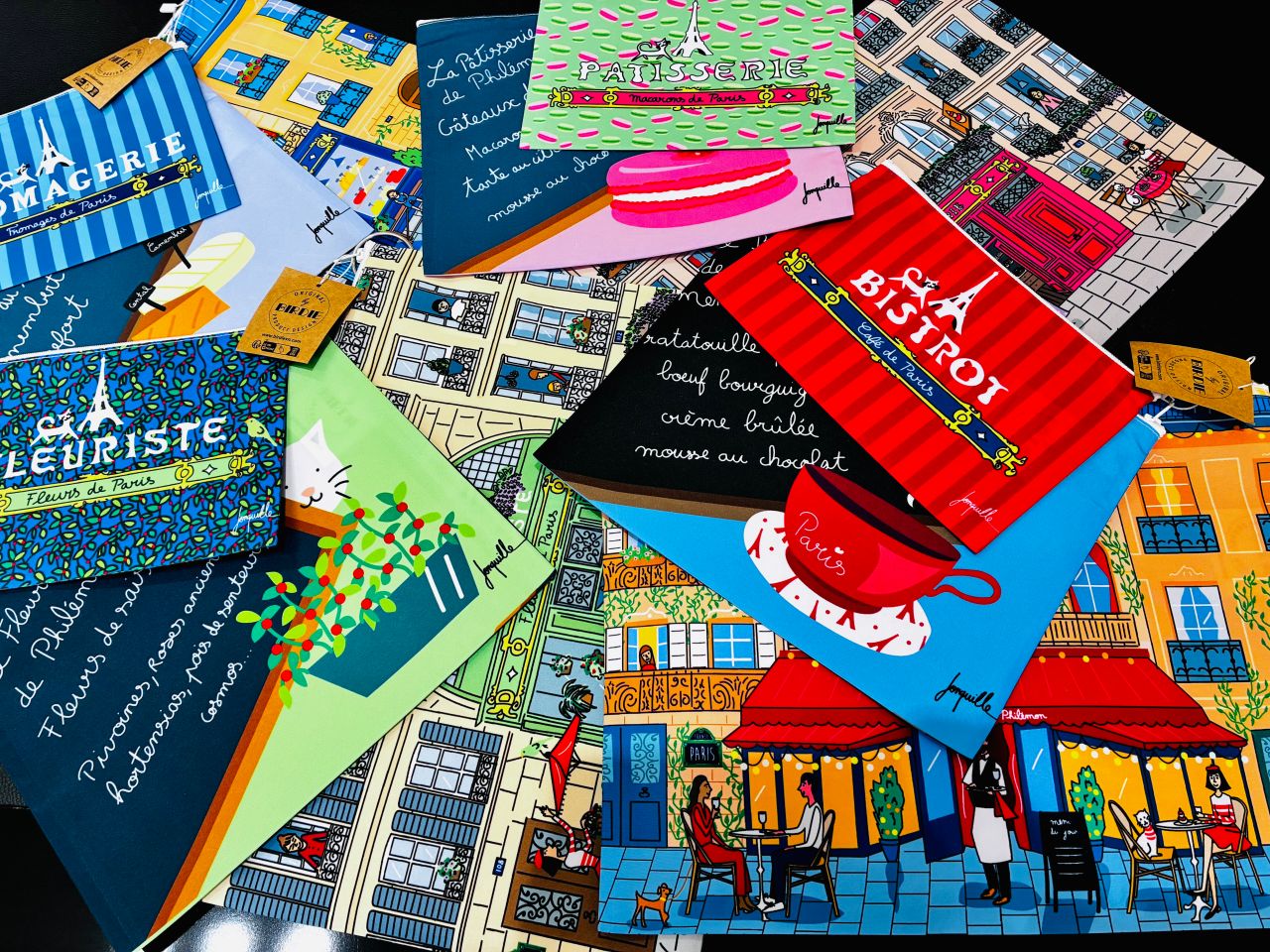 今回入荷のデザインは『パリの〇〇屋さん』にそれぞれ猫ちゃんがいるポーチです。