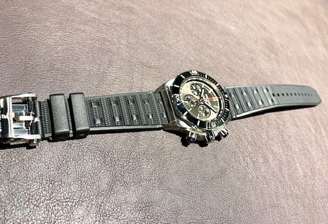重厚感のあるモデルですが、クロノマットシリーズ独自形状のラバーストラップにより、快適に装着できます。