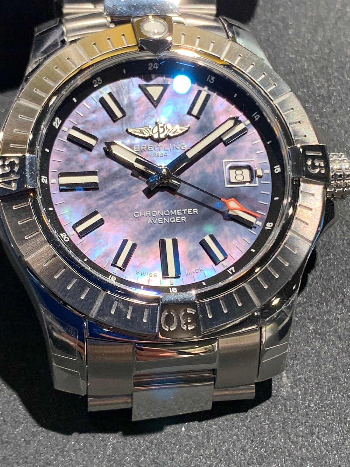 ブラックマザーオブパール(黒蝶貝)と呼ばれる貝を文字盤に使っています。