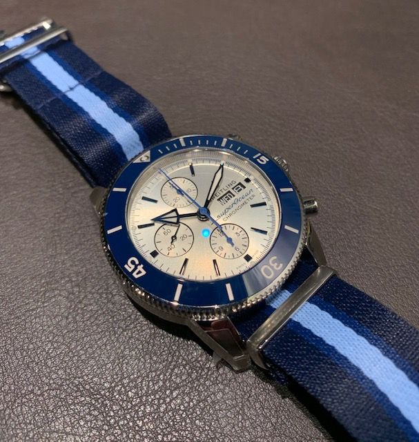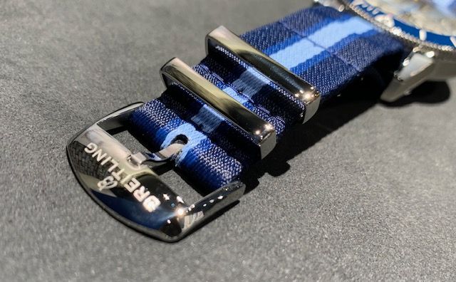 ブライトリングでは珍しいブルーストライプ柄のECONYL®ヤーン製ストラップを備えています。