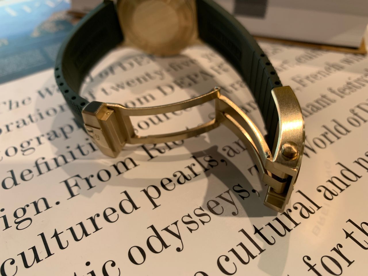 黄金色に輝くブロンズケースと深いグリーンカラーの組み合わせが上品な雰囲気です。