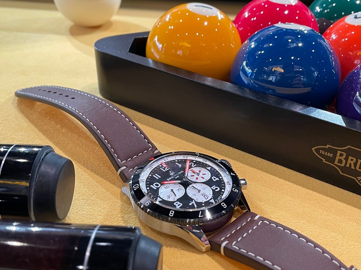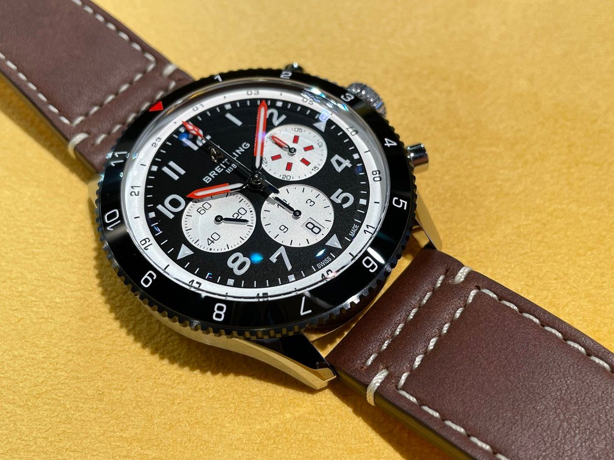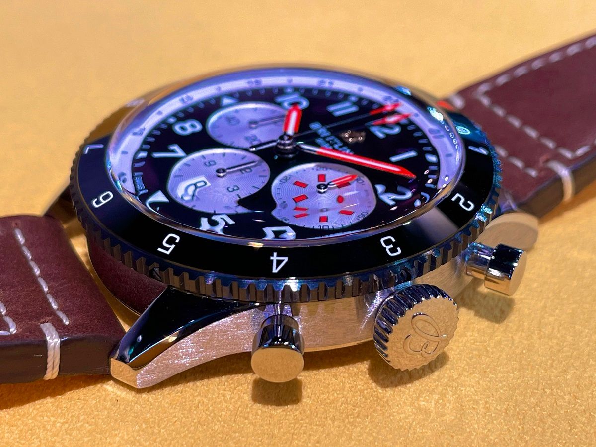 航空機のコックピットをモチーフにしているアビエーターシリーズですが、このモデルは46mmの大ぶりなケースで構成された、GMT機能搭載のクロノグラフです。