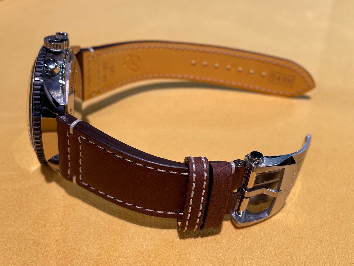 ヴィンテージ感のあるカーフストラップには、フライトギアにあしらわれた縫い目をイメージしたステッチが入っています。