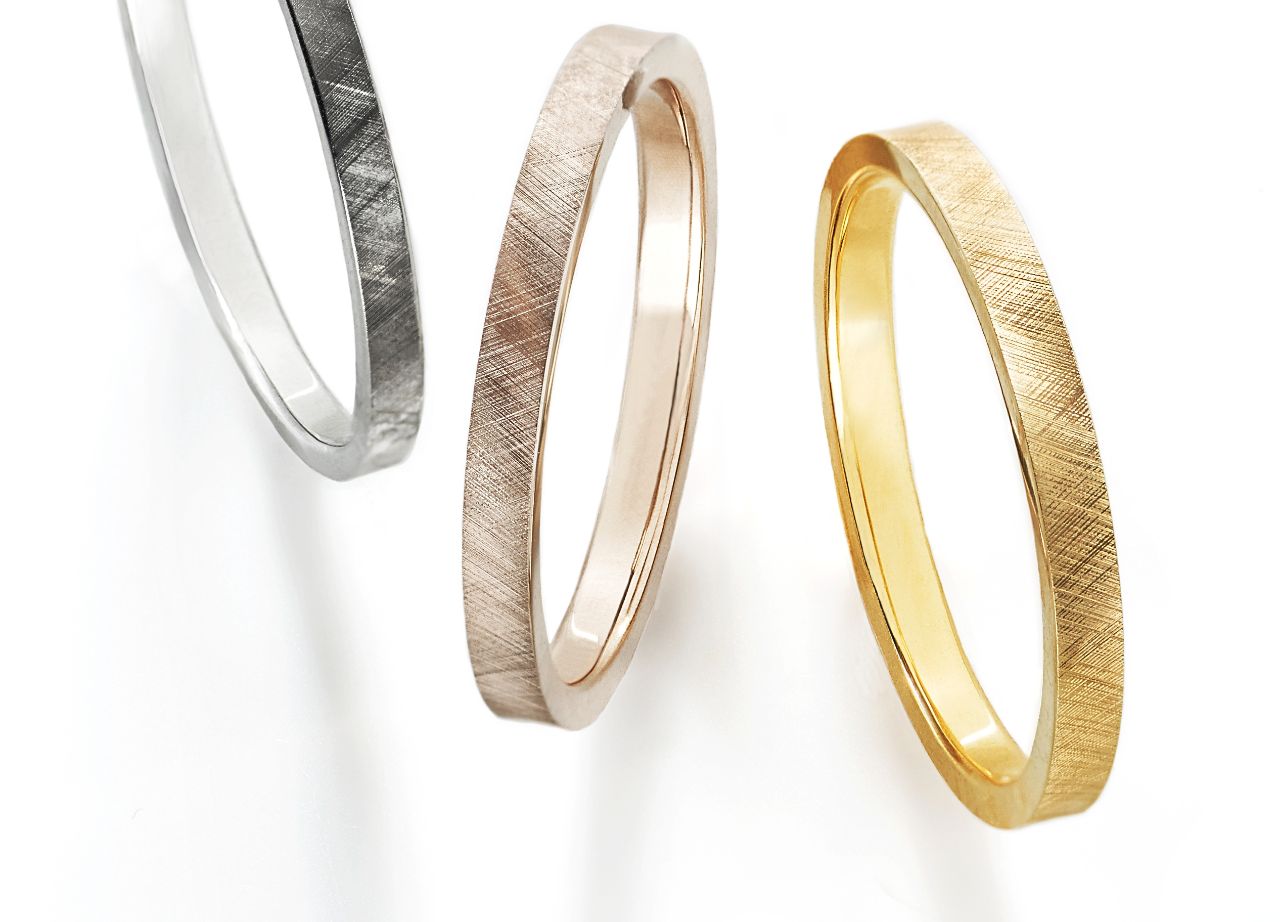 それによって、光が当たると反射して全体がキラキラと輝く、シンプルな中に控え目な華やかさを持ったリングです。
