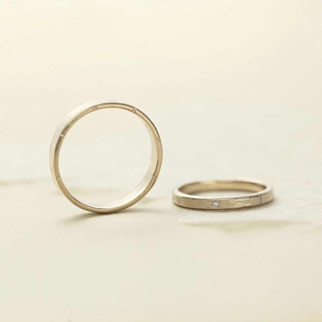ともにナチュラルな肌合いの仕上げとなっており、温かみ溢れる優しい雰囲気のリングです。