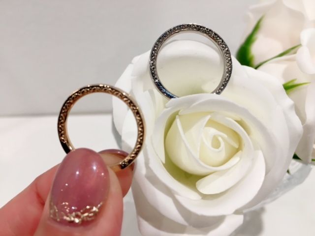 マリッジリングには、サイドにバラのつぼみのような模様が施されていて