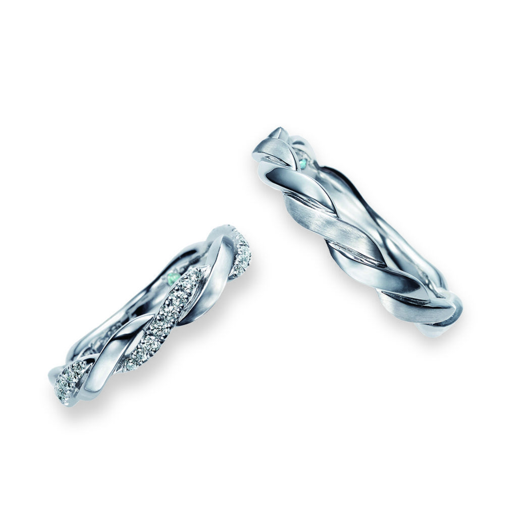 立体感のあるデザインに、ダイヤモンドが華やかにセッティングされたモデル(左)と、