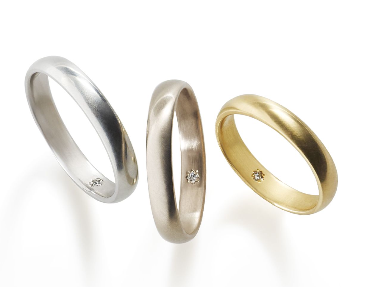 素材は左からプラチナ、ナチュラルホワイトゴールド、イエローゴールドでお作り頂けます。