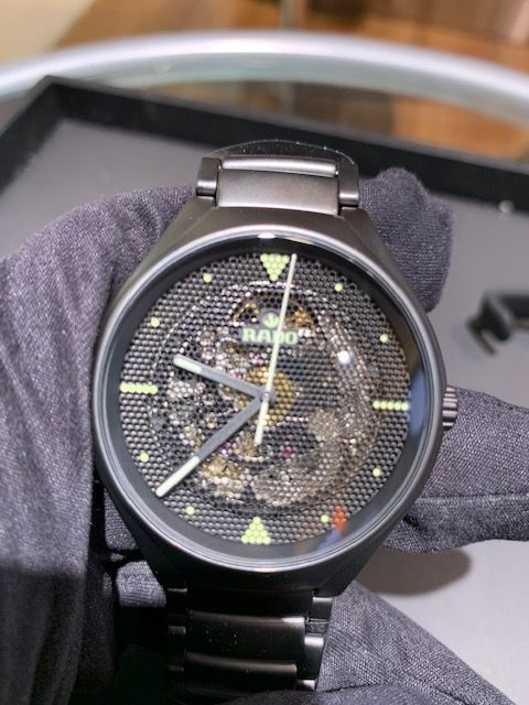 傾けた時にうっすら見えるオシャレなスケルトンの文字盤が