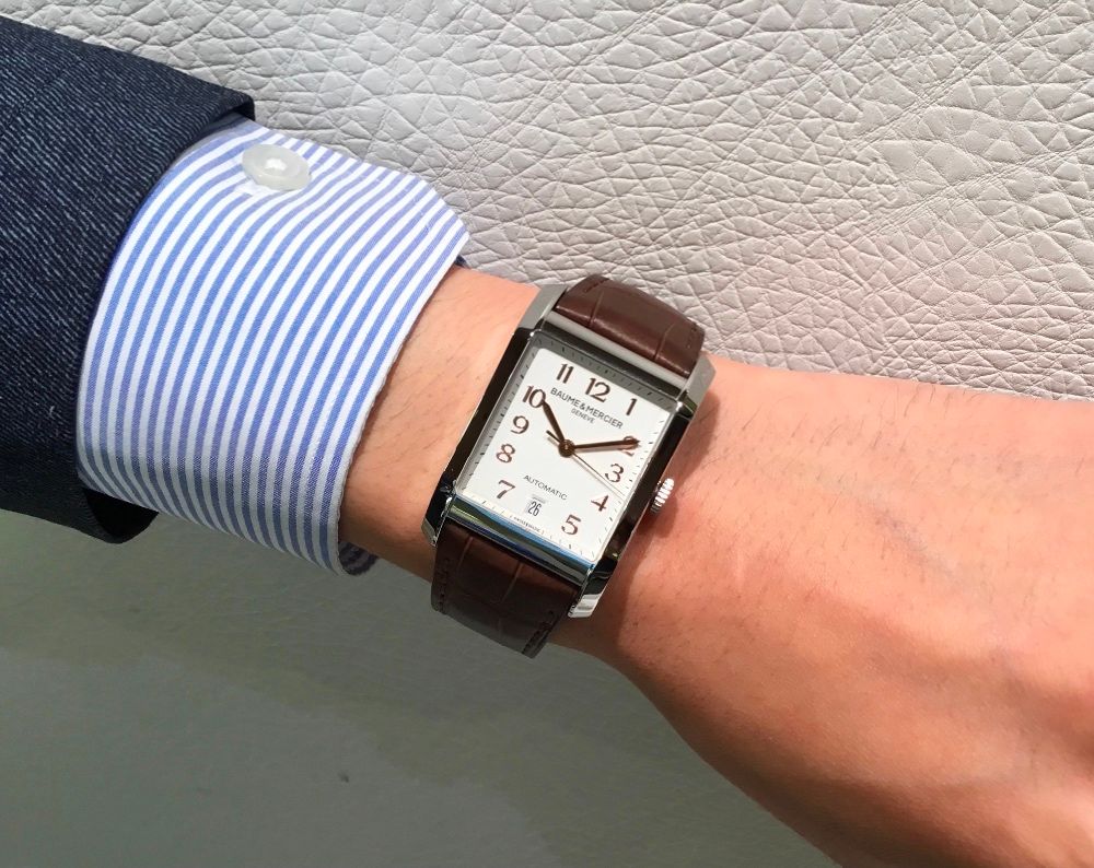 誠実な印象を与えるシンプルなレクタンギュラーウォッチは、