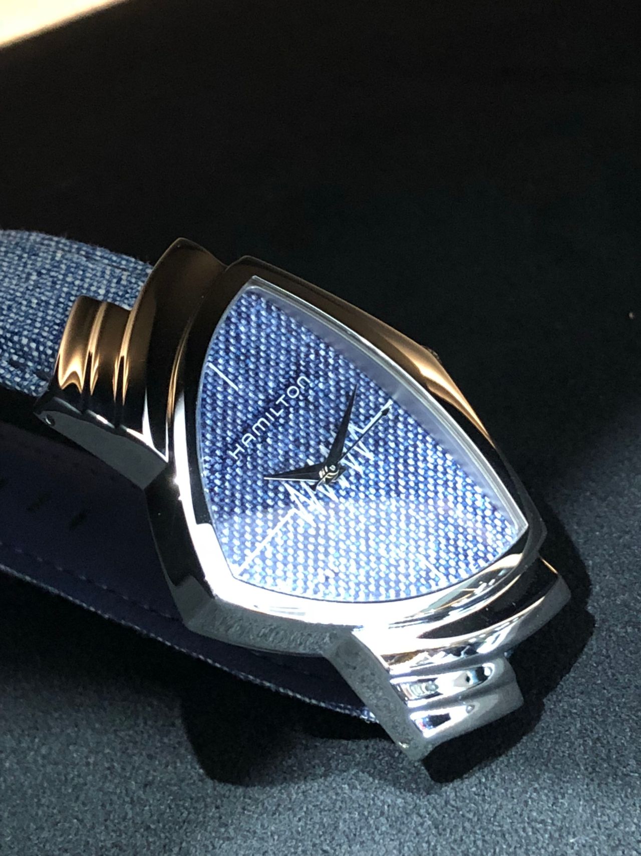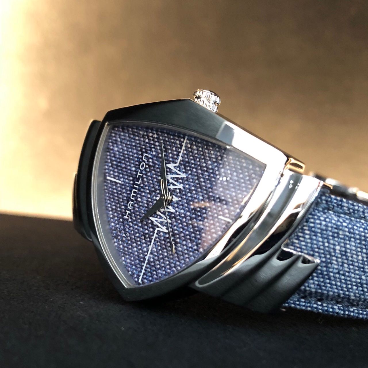ベンチュラが発表された1950年代に若者に流行したデニムを文字盤やベルトに使用しています。