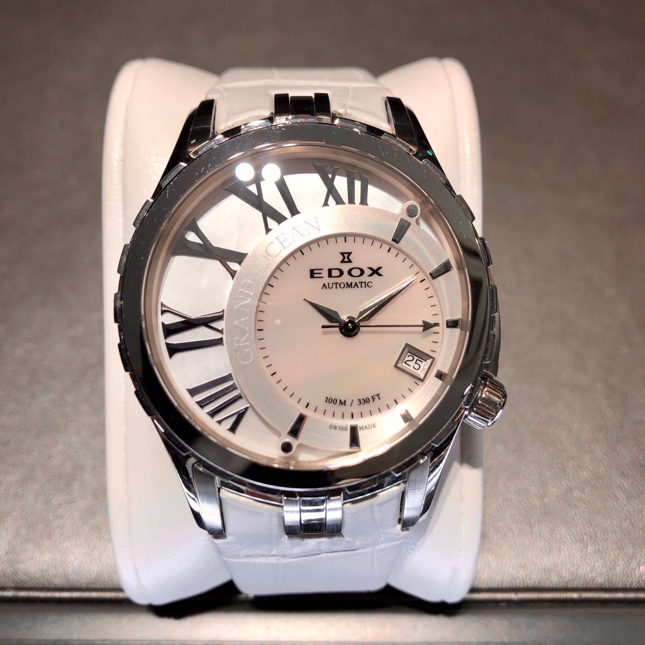 文字盤にはシェルを使用し、女性らしい優美な印象です。