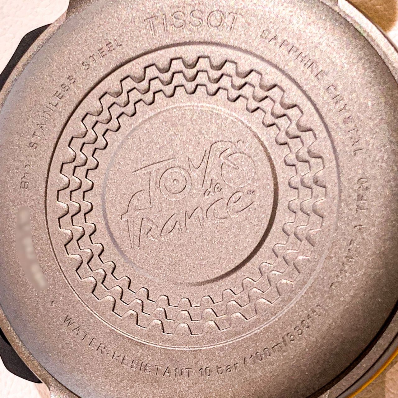 裏蓋にはツール・ド・フランスのロゴとカセットスプロケットをモチーフにしたデザインが刻まれ