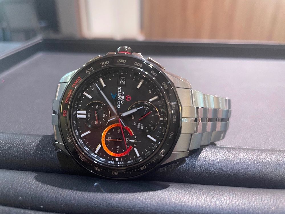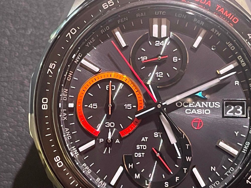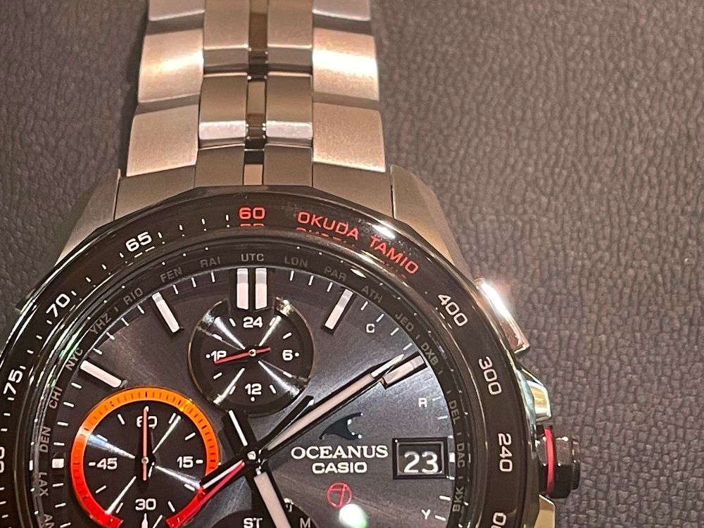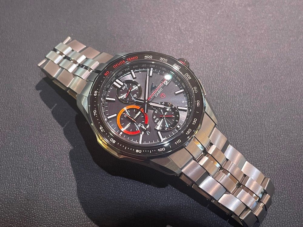 サファイアガラスベゼルには、「OKUDA TAMIO」の文字と