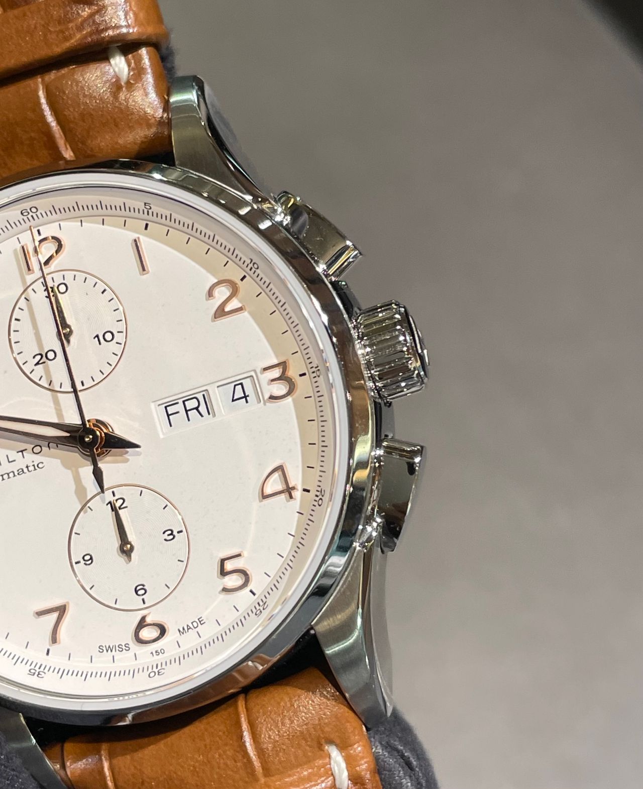 ピンクゴールドのアラビア数字とミニッツインデックスが