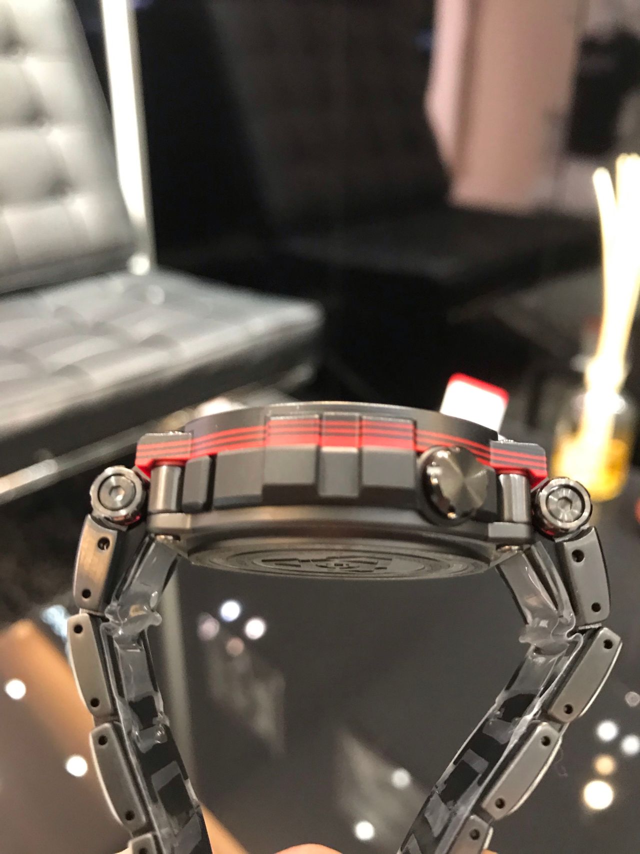 特徴的なベゼル部分はカーボンシートを重ねて形成されています。