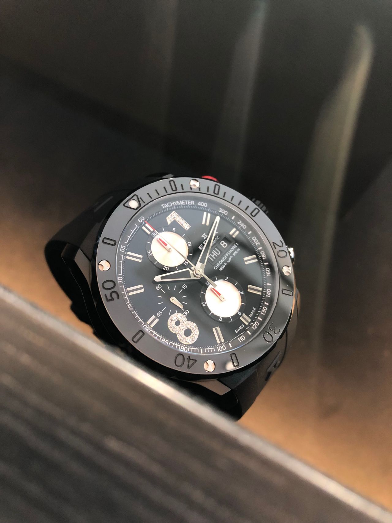 ブラックのケースにプッシュボタンとクロノグラフ針の赤が映えとてもカッコいいです!!