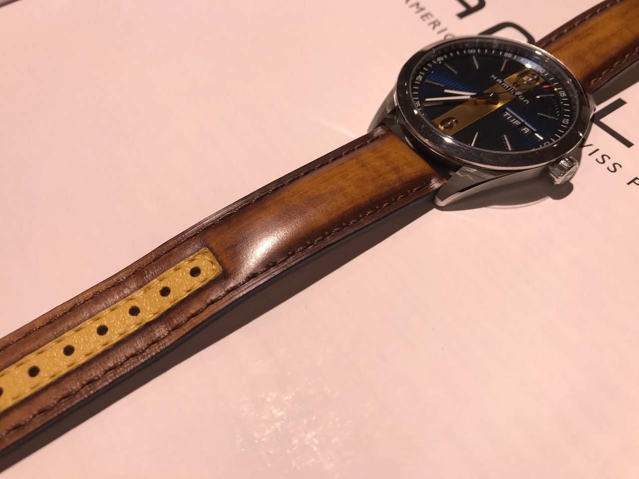 ベルトには文字盤のイエローと同じ色が配されており、