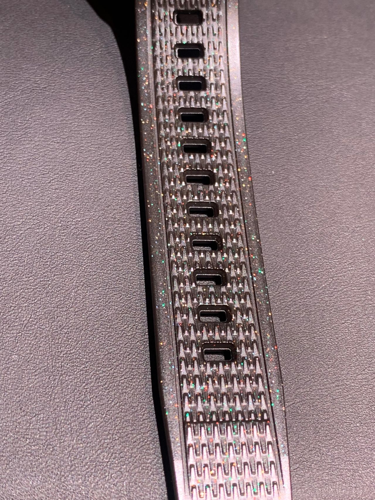 バンドには多色のアルミ素材を混ぜたブラックのソフトウレタン素材を使用しています。