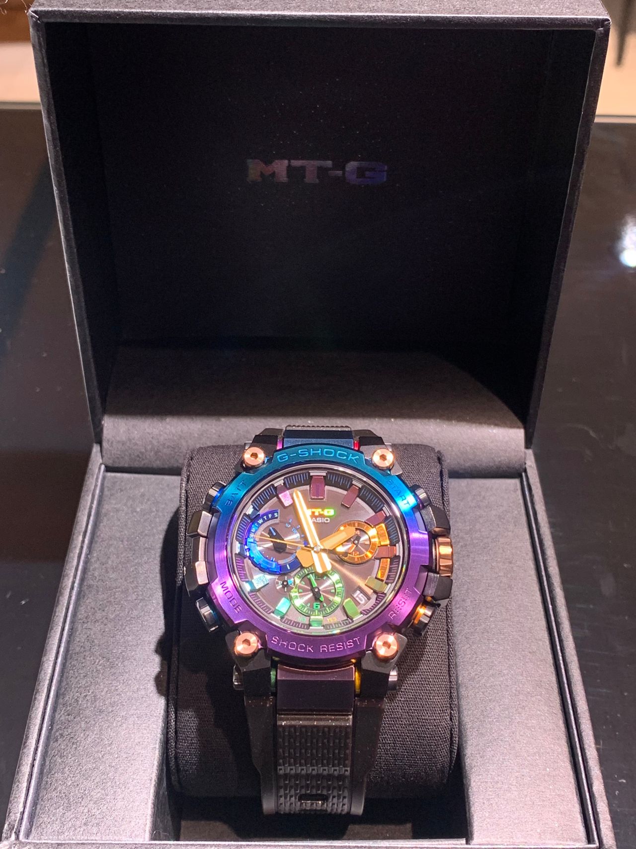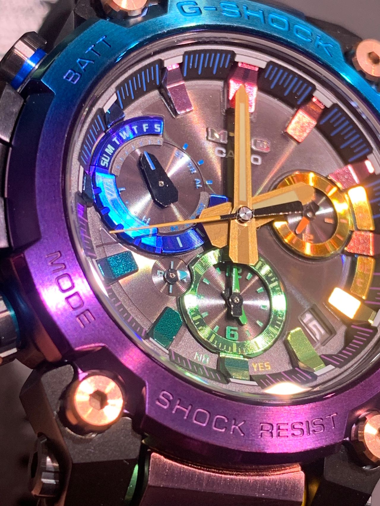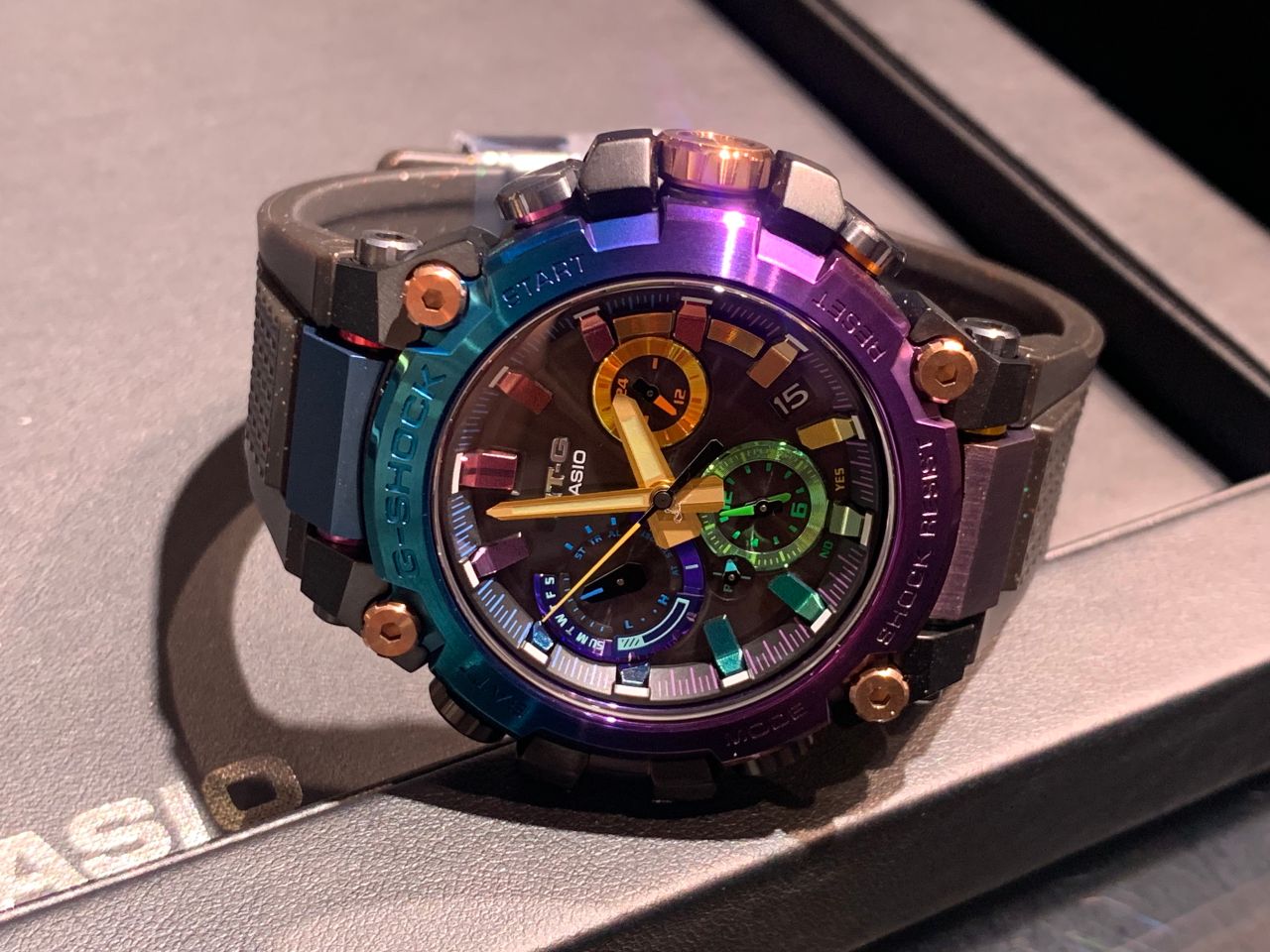ステンレスベゼルにはブルーとパープルのグラデーションIPコーティングを行っており