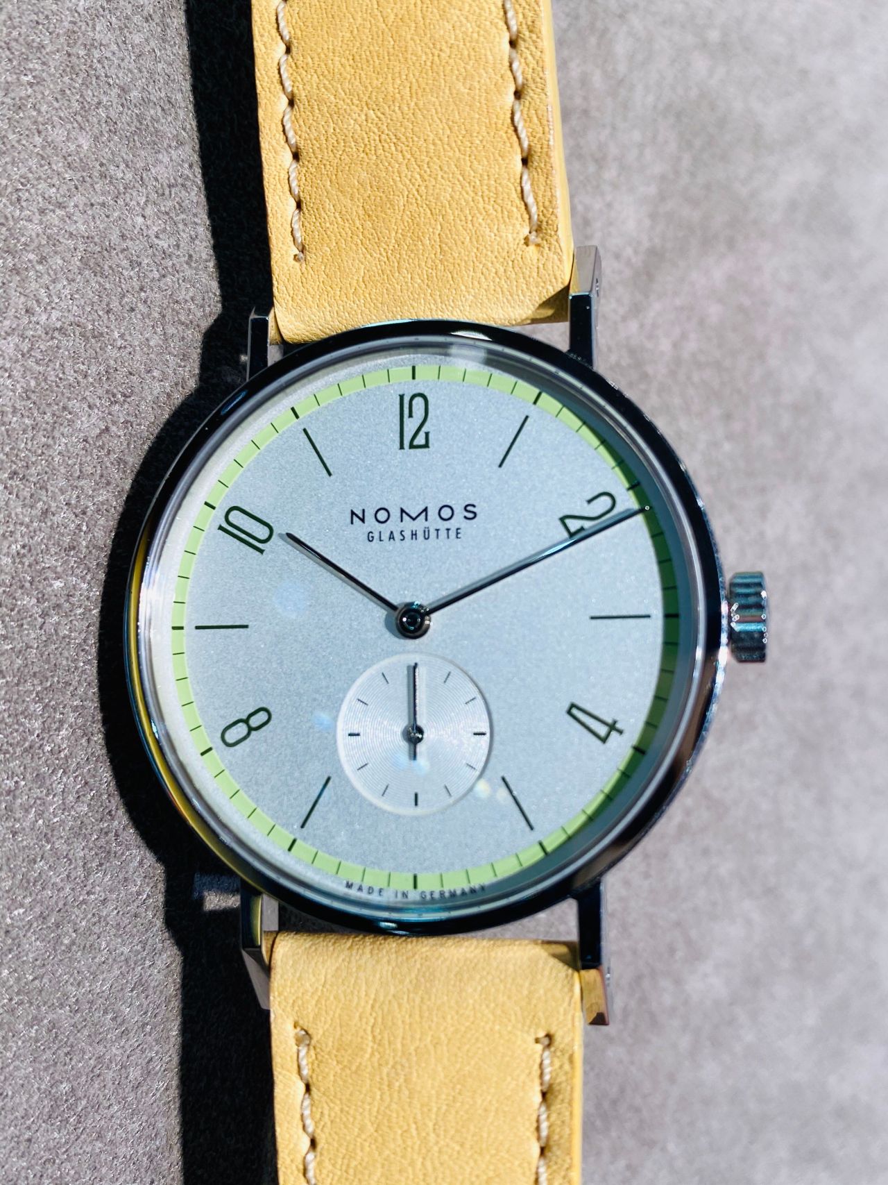 草木染めで珍しい黄色系のストラップに若葉のグリーンカラーを外周リングにあしらっているモデルです。