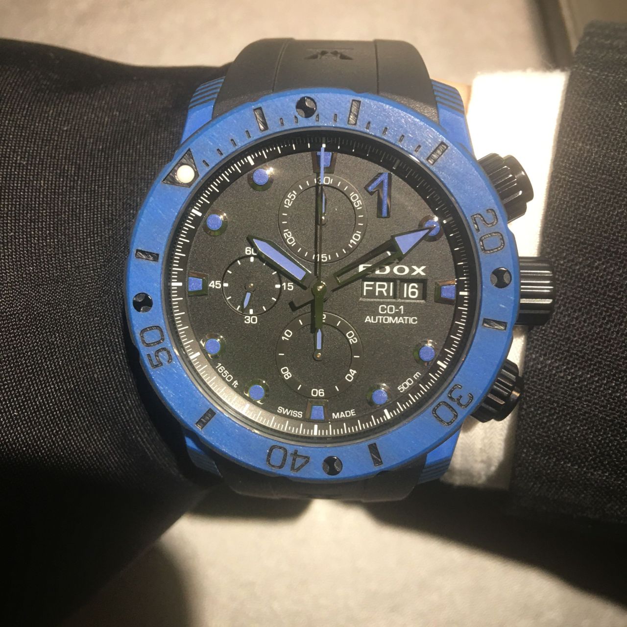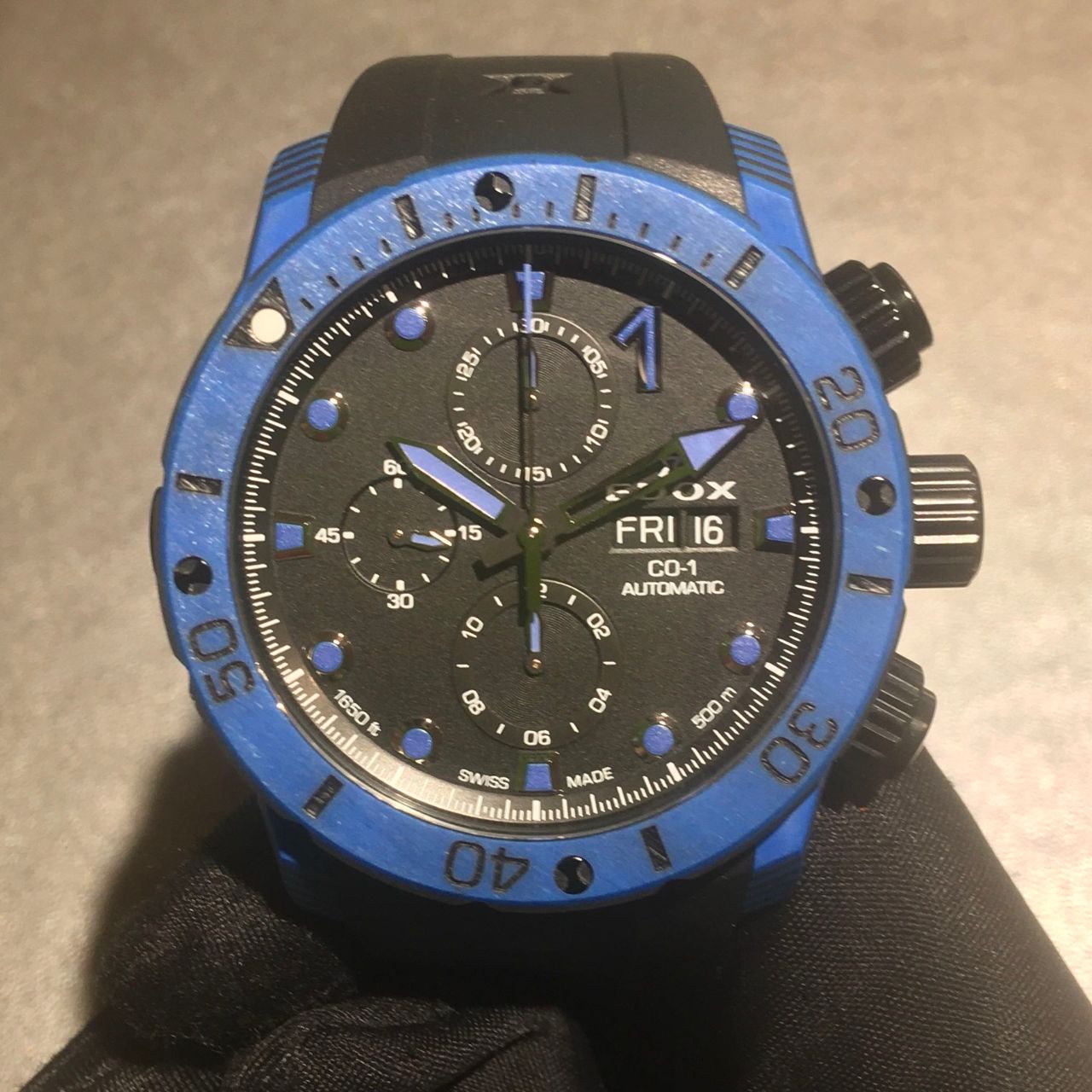 こちらのクロノオフショア1は従来のモデルとは違い軽量で頑丈なカーボン素材の採用する事により軽量化に成功し 美しい青色をつける事によって黒色とマッチし 視認性を抜群に高めています!