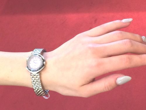 文字盤にはマザーオブパールのシェル素材に12Pのブリリアントカットダイヤモンドが大人可愛いモデルです。
