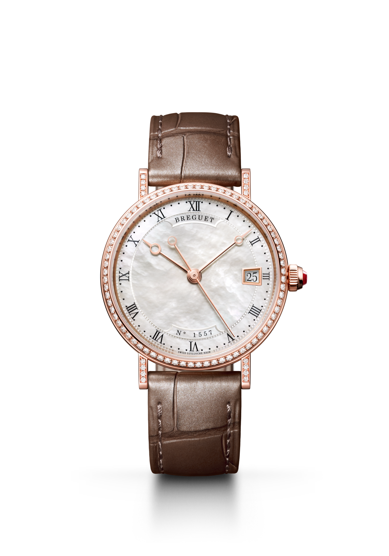 やわらかな光を放つマザーオブパールの文字盤と、落ち着いたブラウンレザーの組み合わせは
