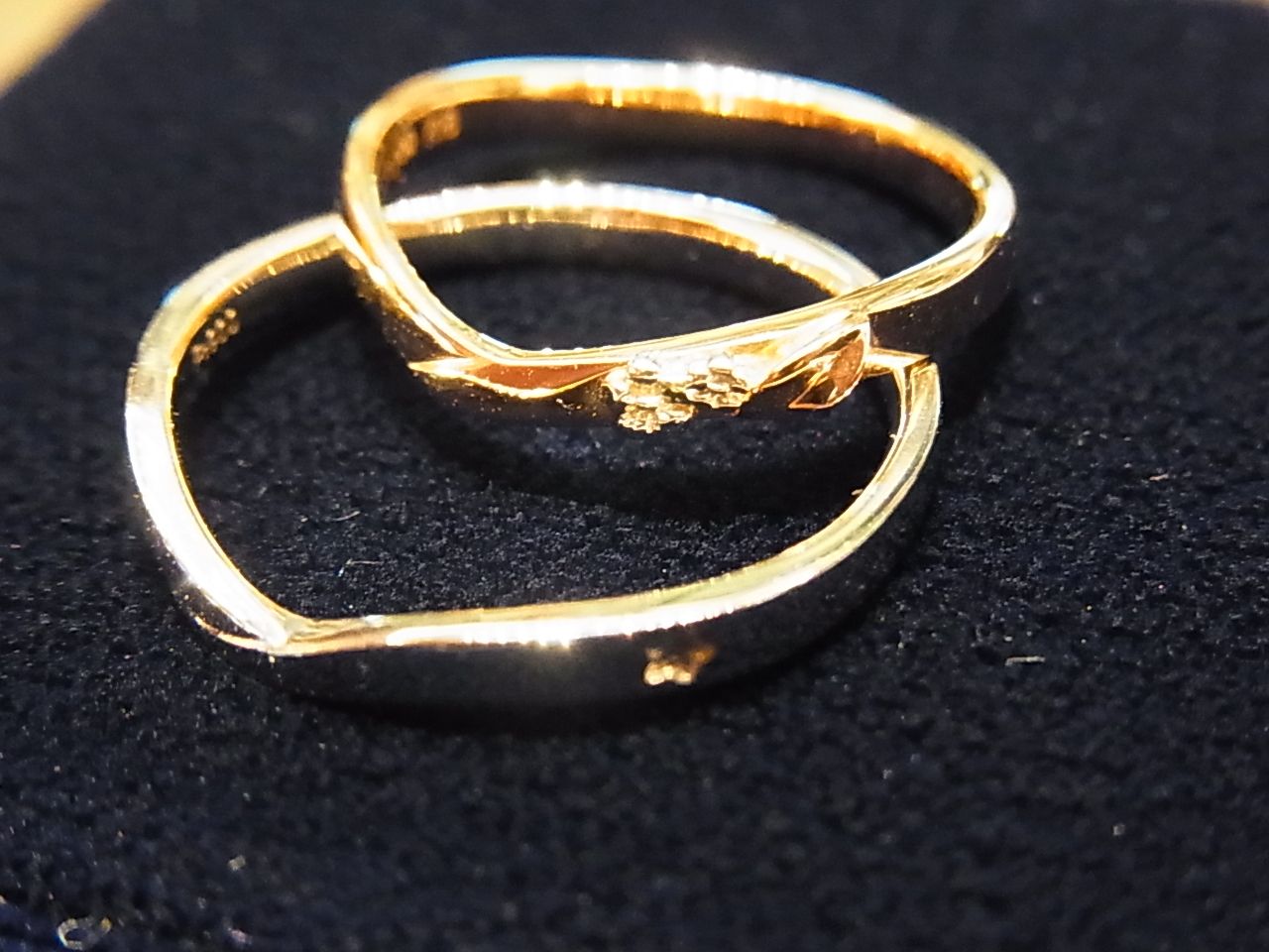 男性用のリングは、ジャスミンの葉を一枚、凹みデザインでサイドに添えました。