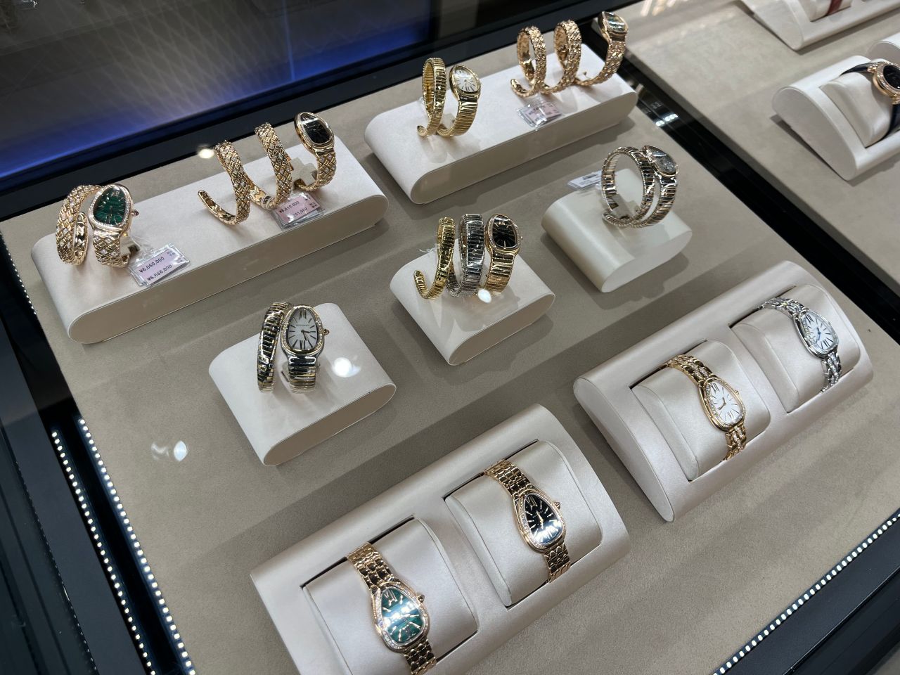 セルペンティなどの女性用の時計の展示数を増やしています!普段は見れないゴールドの時計や二重、三重巻きの時計を展示しています!