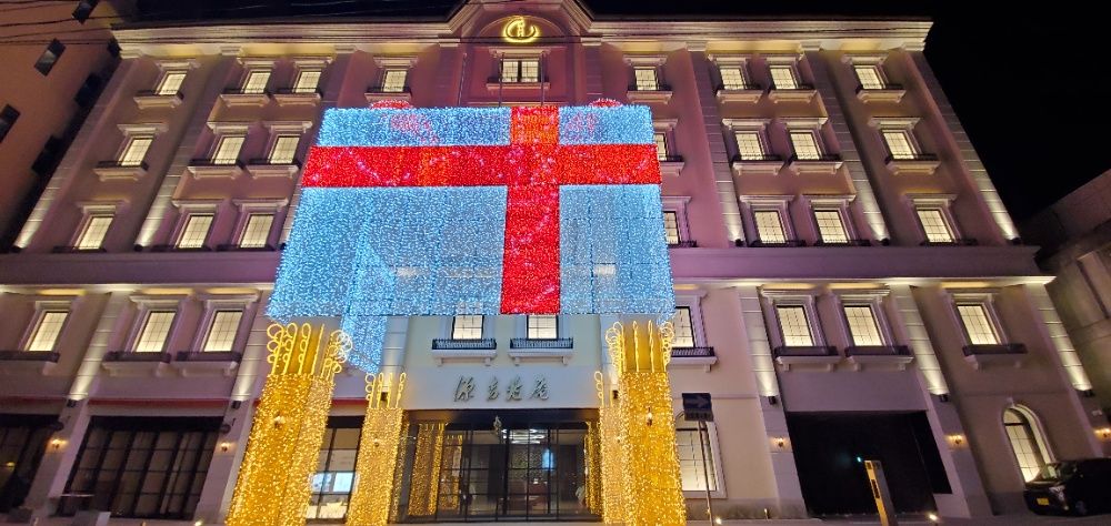 おしゃれな外観と夜に点灯される入口のリボンボックスの