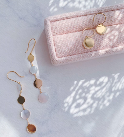 左)K18ルナエクリプスマザーオブパールピアス 188,100円(全長5㎝)