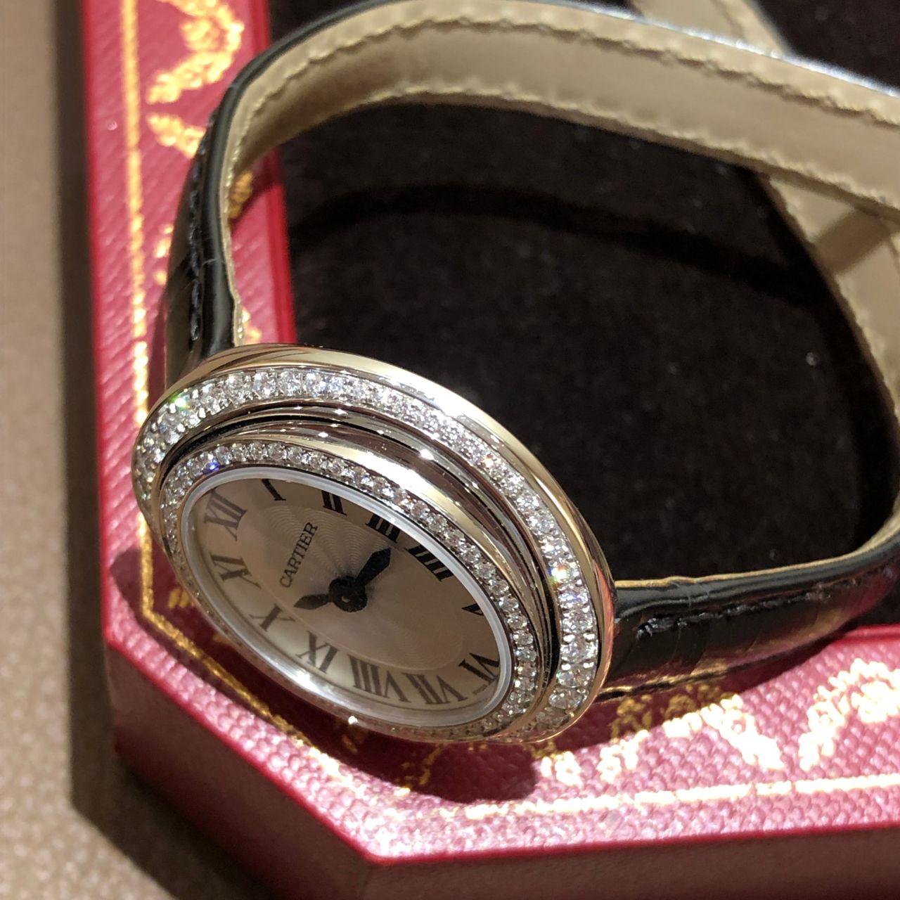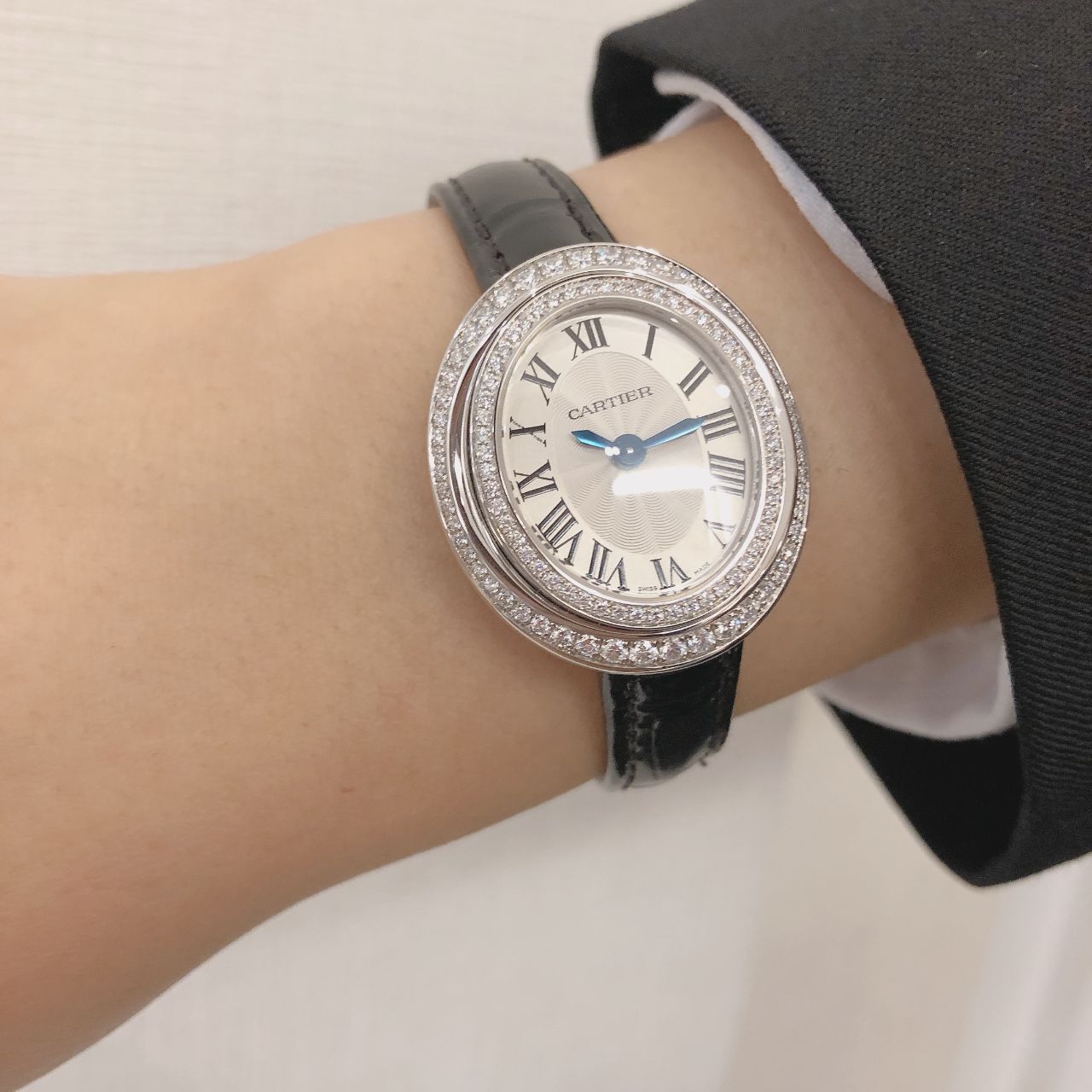 オーバルシェイプのケースに、ダイヤモンドがセッティングされた2重のベゼルが
