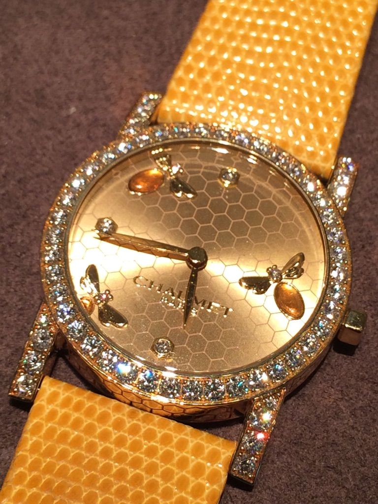文字盤のハニカムモチーフの上にミツバチが飛んでいます
