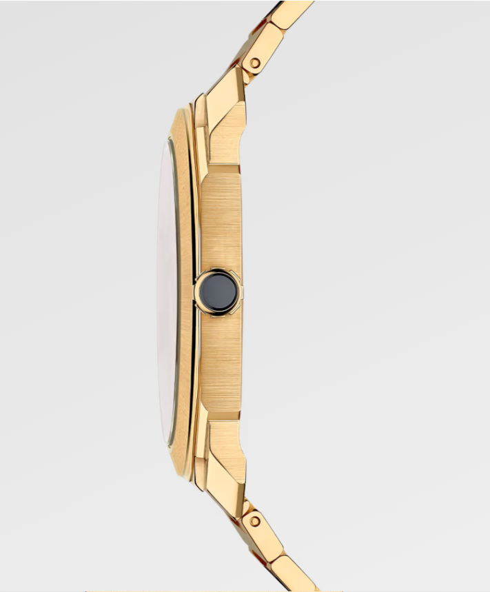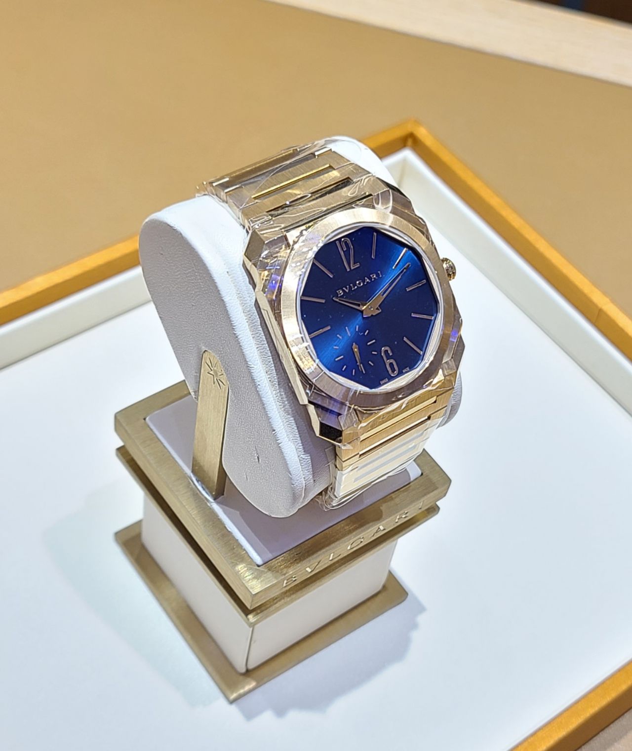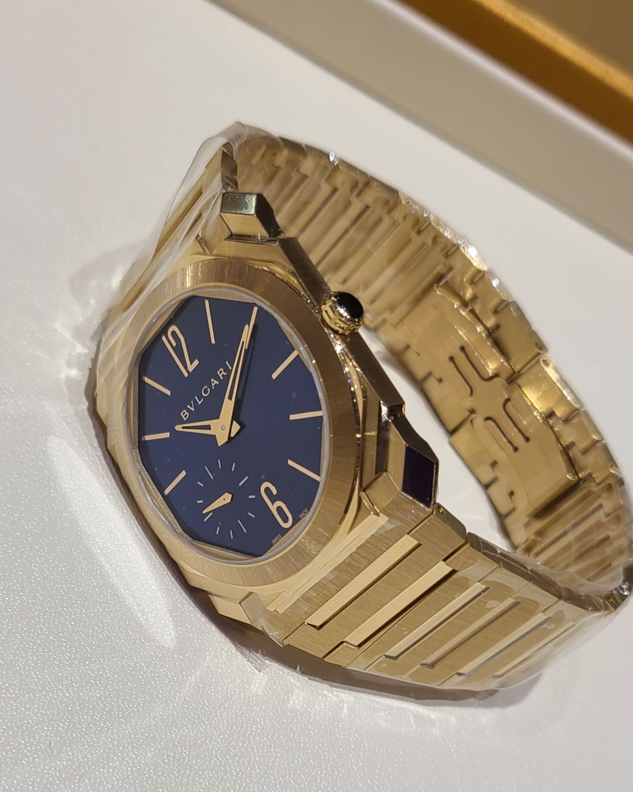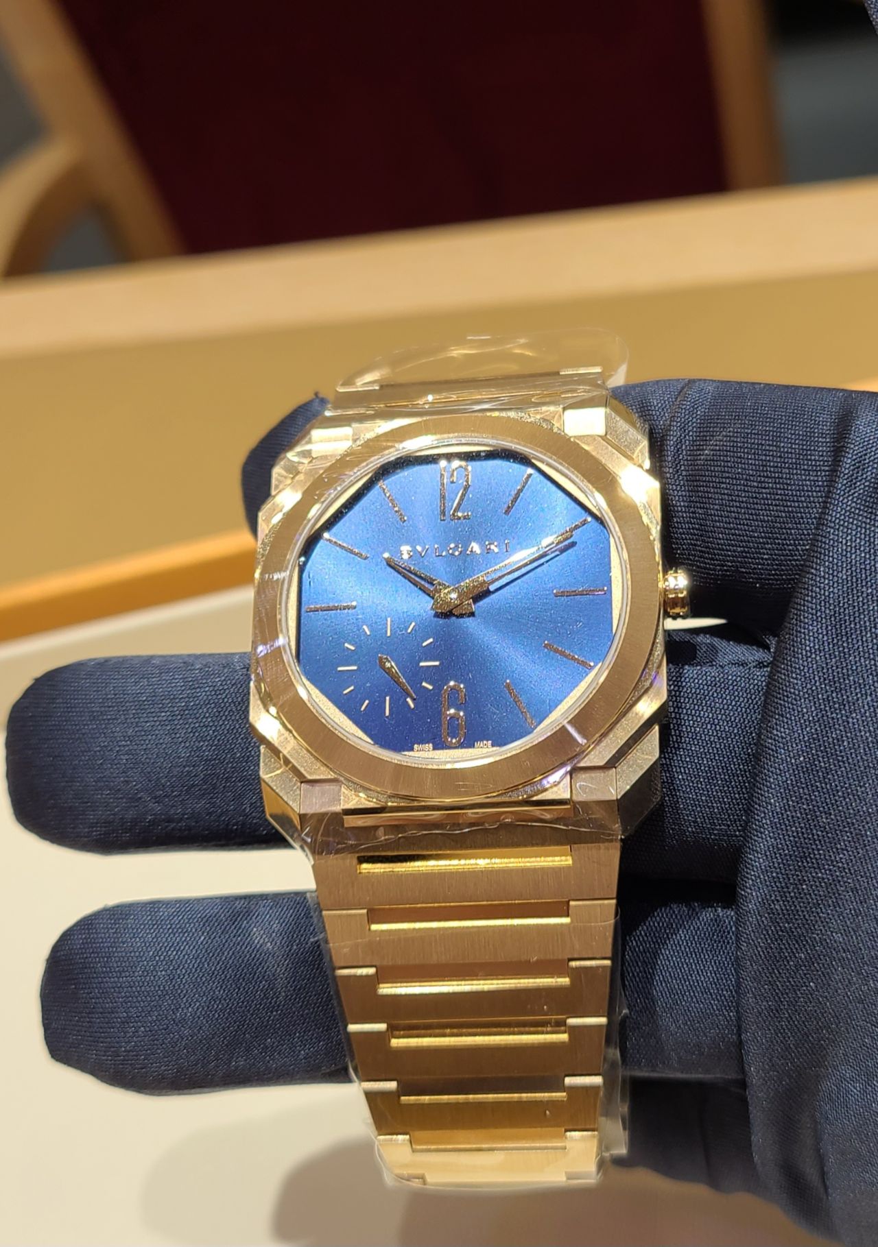上品に輝くイエローゴールドのケースとブレスに美しい青文字盤!