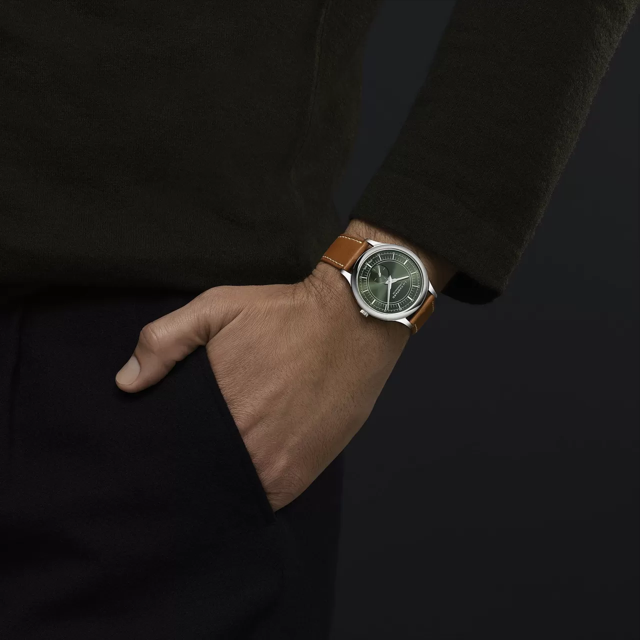 新色ダークグリーンで彩られたセクタータイプの文字盤は、