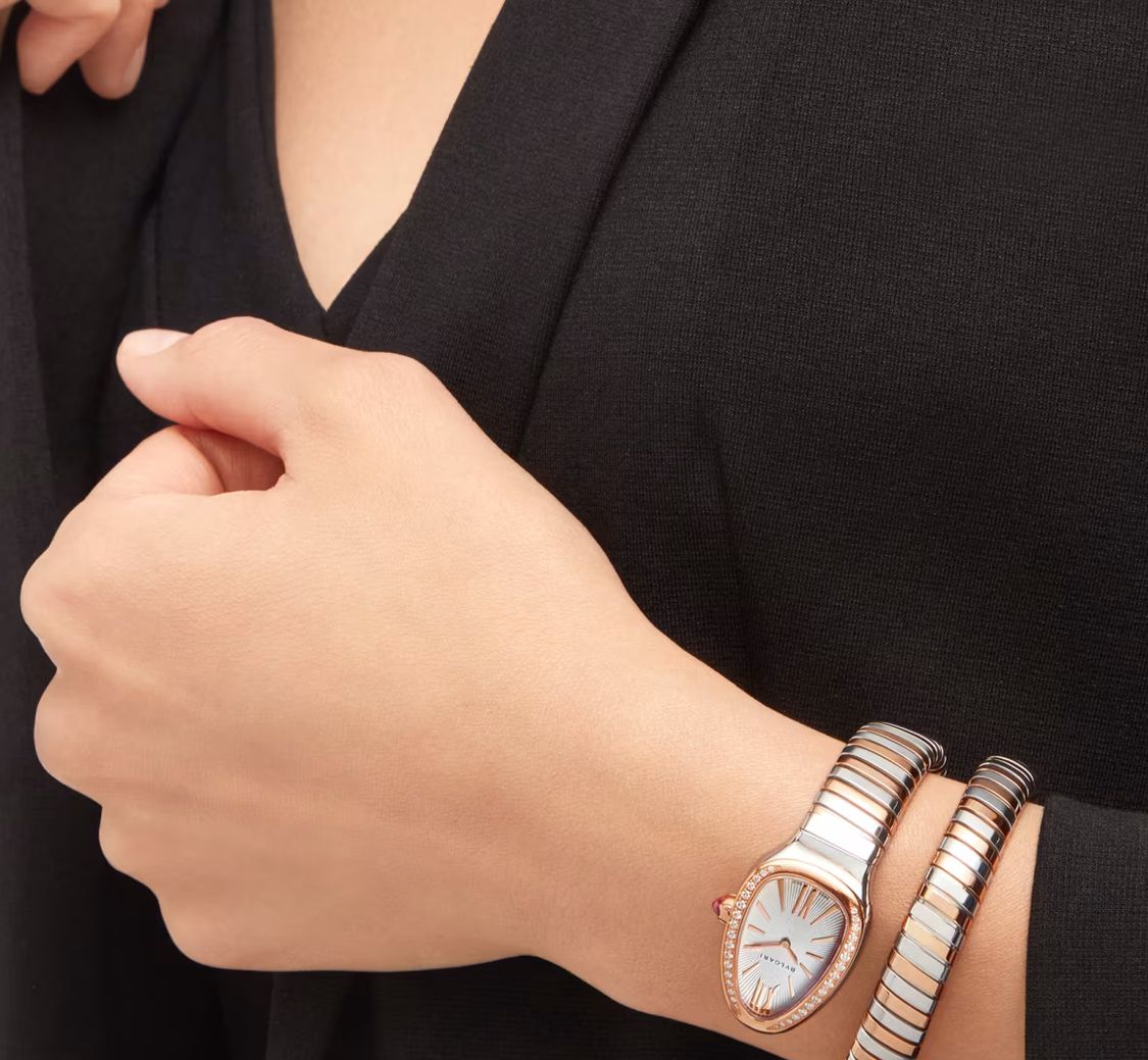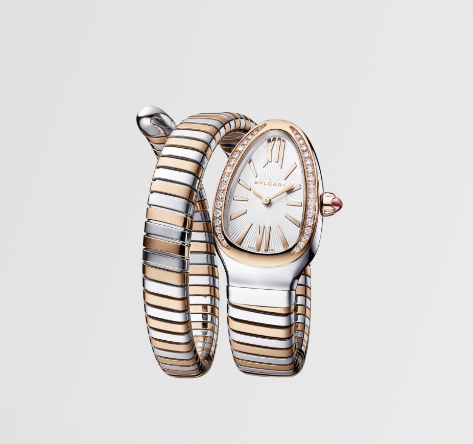 ブルガリのデザインが誇るもっとも象徴的なシンボルの2つを融合させたセルペンティトゥボガスウォッチ。