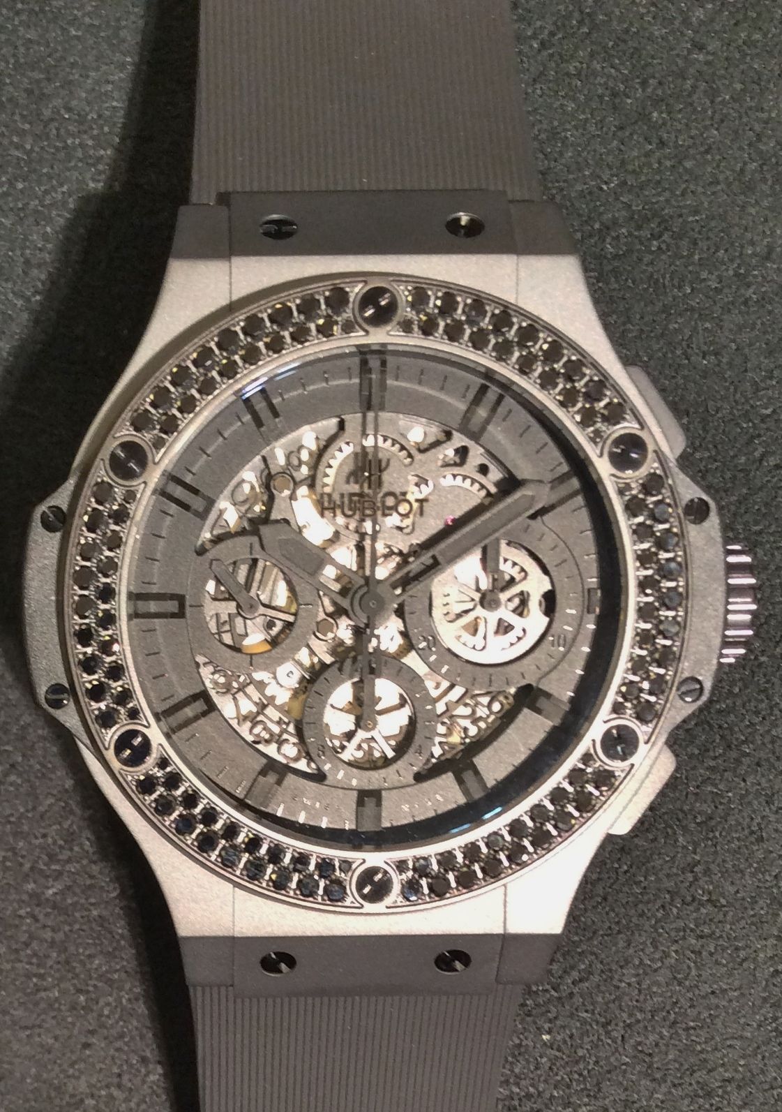 ベゼルにはブラックダイヤモンドが2列でセッティングされ、文字盤はスケルトン文字盤、ケースはブラックセラミック仕様とここまで黒にこだわったモデルはウブロでなければ実現できません!!