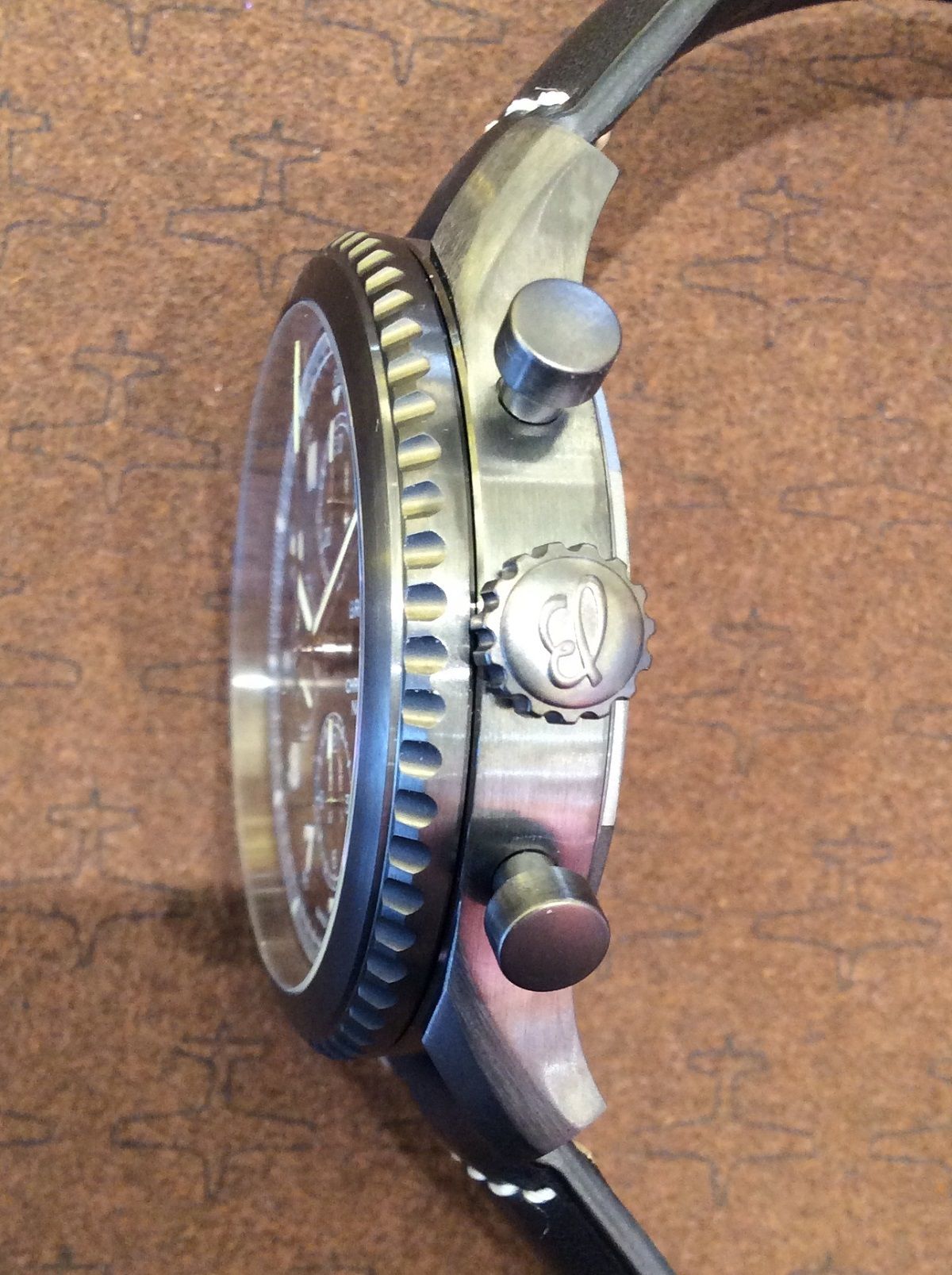 仕様:自動巻きクロノグラフムーブメント(ブライトリング13)、ドーム型サファイアクリスタル(両面無反射コーティング)、ポインター付き両方向回転ベゼル、ねじ込み式リュウズ、10気圧防水