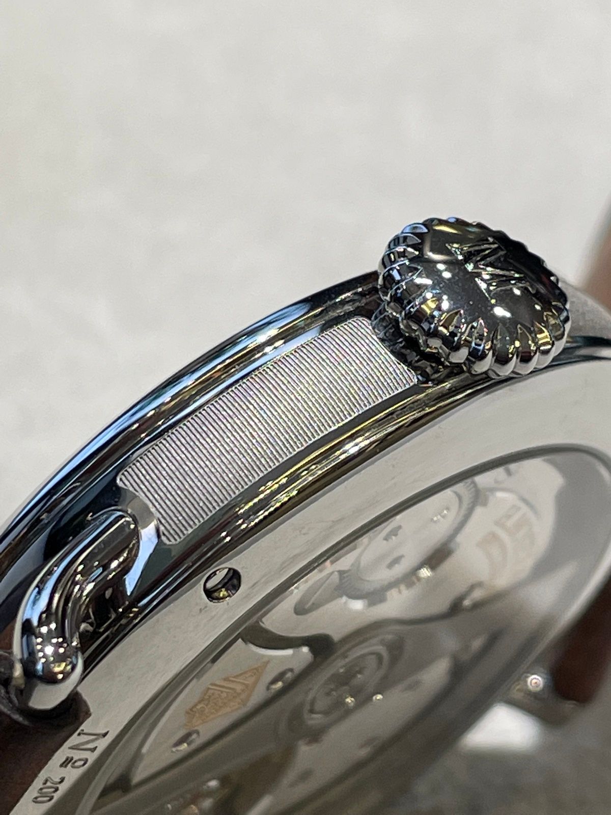 ケースには部分的に細か~いコインエッジが施され、古典的な仕上がりです。
