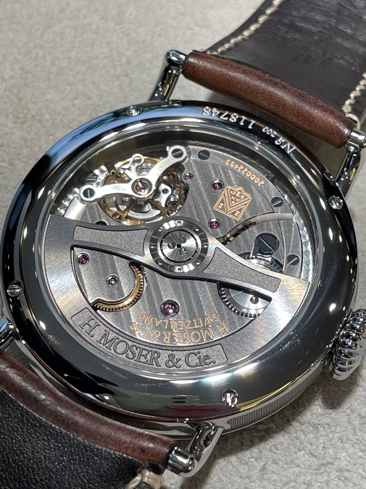 裏蓋からはモーザーらしい、圧倒されるほど美しいムーブメントが覗きます!!