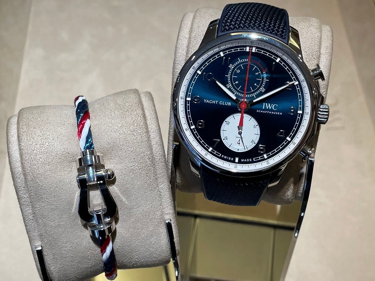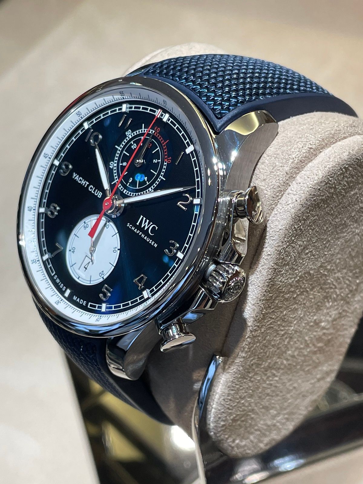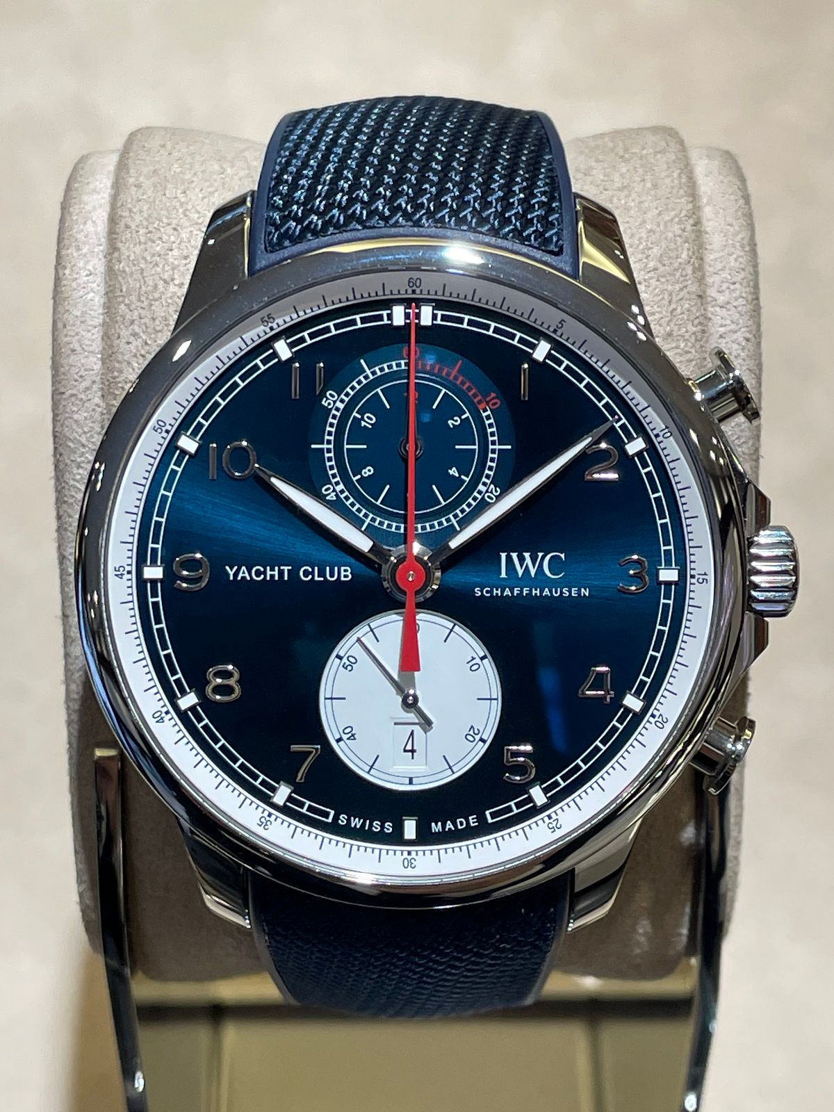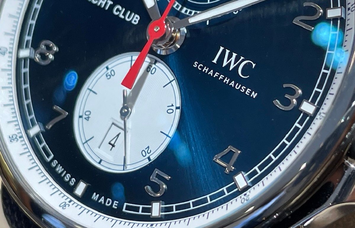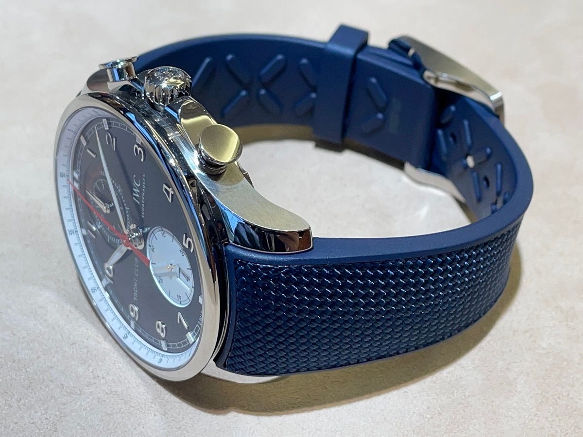 44mmの存在感のあるポルトギーゼ・ヨットクラブ・クロノグラフのケースに、深い青の文字盤赤いクロノグラフ針がとても印象的ですね。