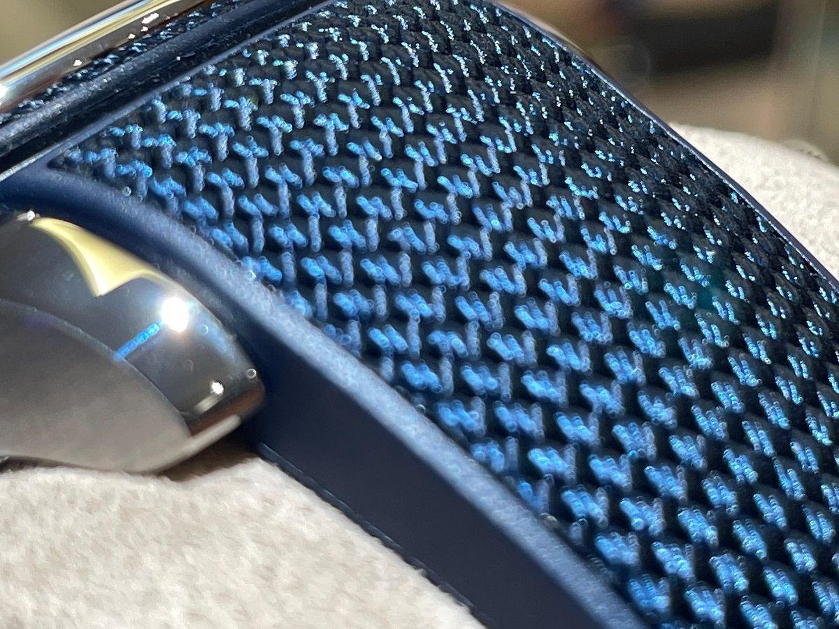 布製はめ込み加工が施されたブルーのラバーストラップを採用しており、スポーティなだけでは無く心地良いフィット感も得られます。