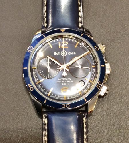 仕様:自動巻き、クロノグラフ、ねじ込み式リューズ、ブルーカーフスキンストラップ