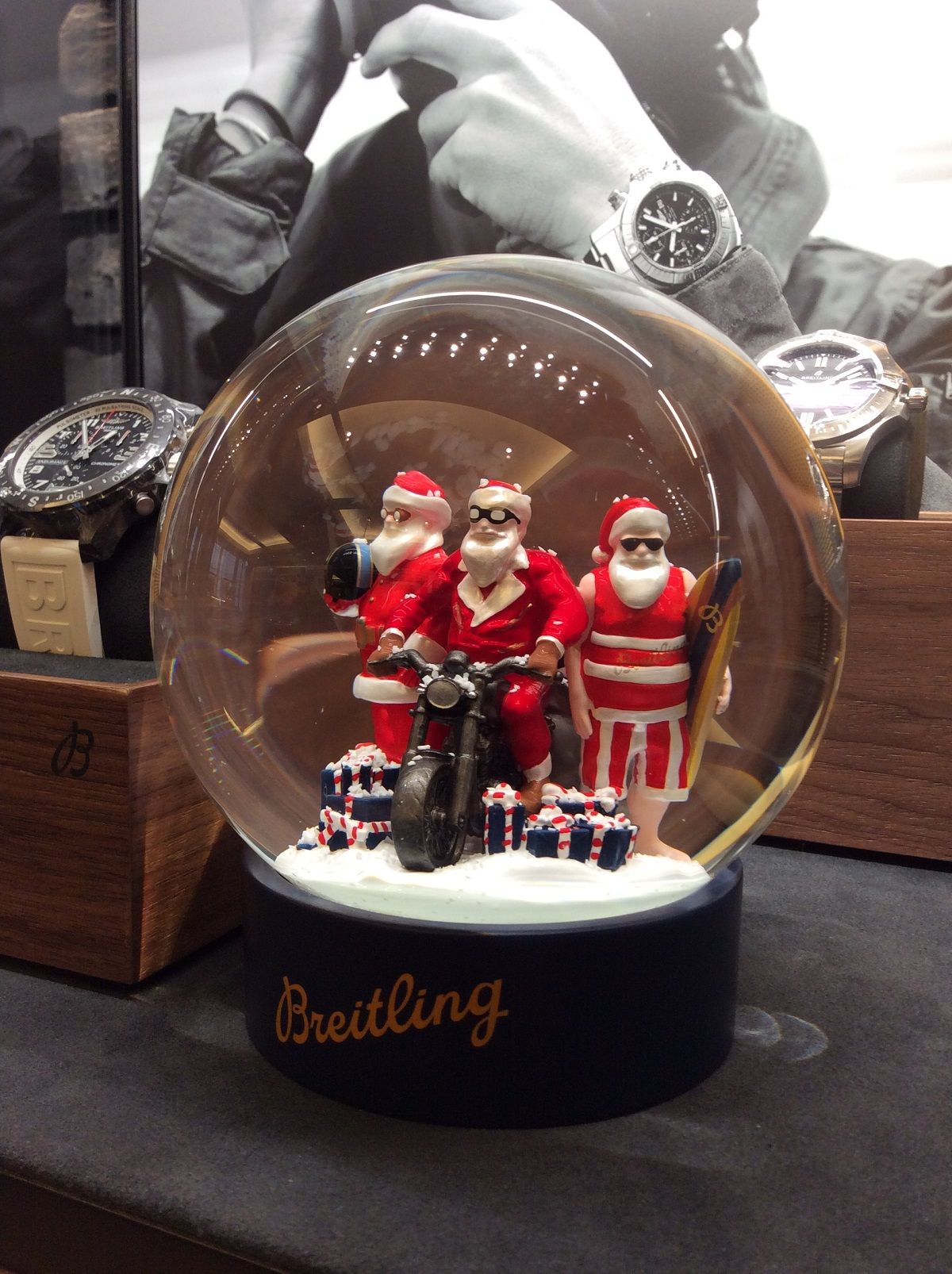 ブライトリングのロゴマークが入ったスノードームには3人のサンタクロースが!