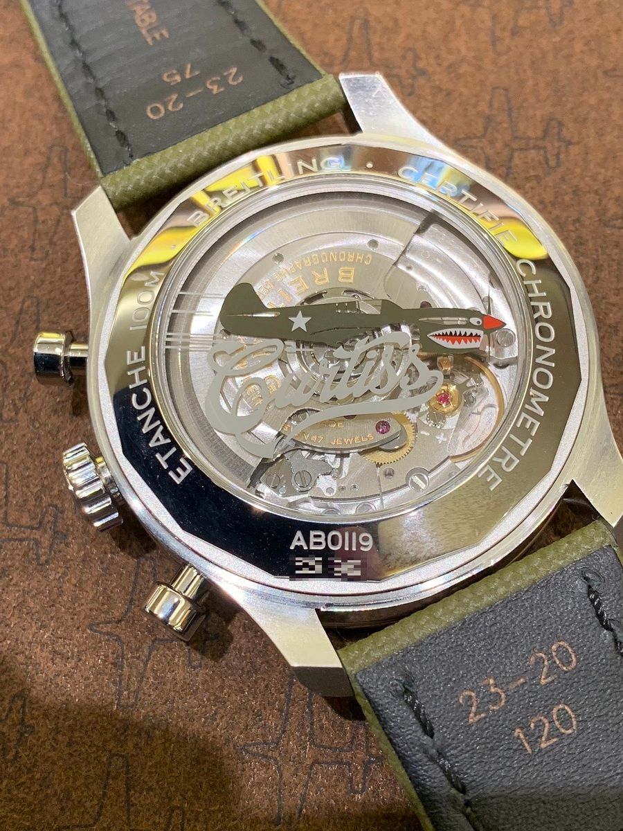 裏蓋も、B01搭載モデルはシースルーバック採用で内部を見て頂けます。プリントのウォーホークがオシャレですよね!