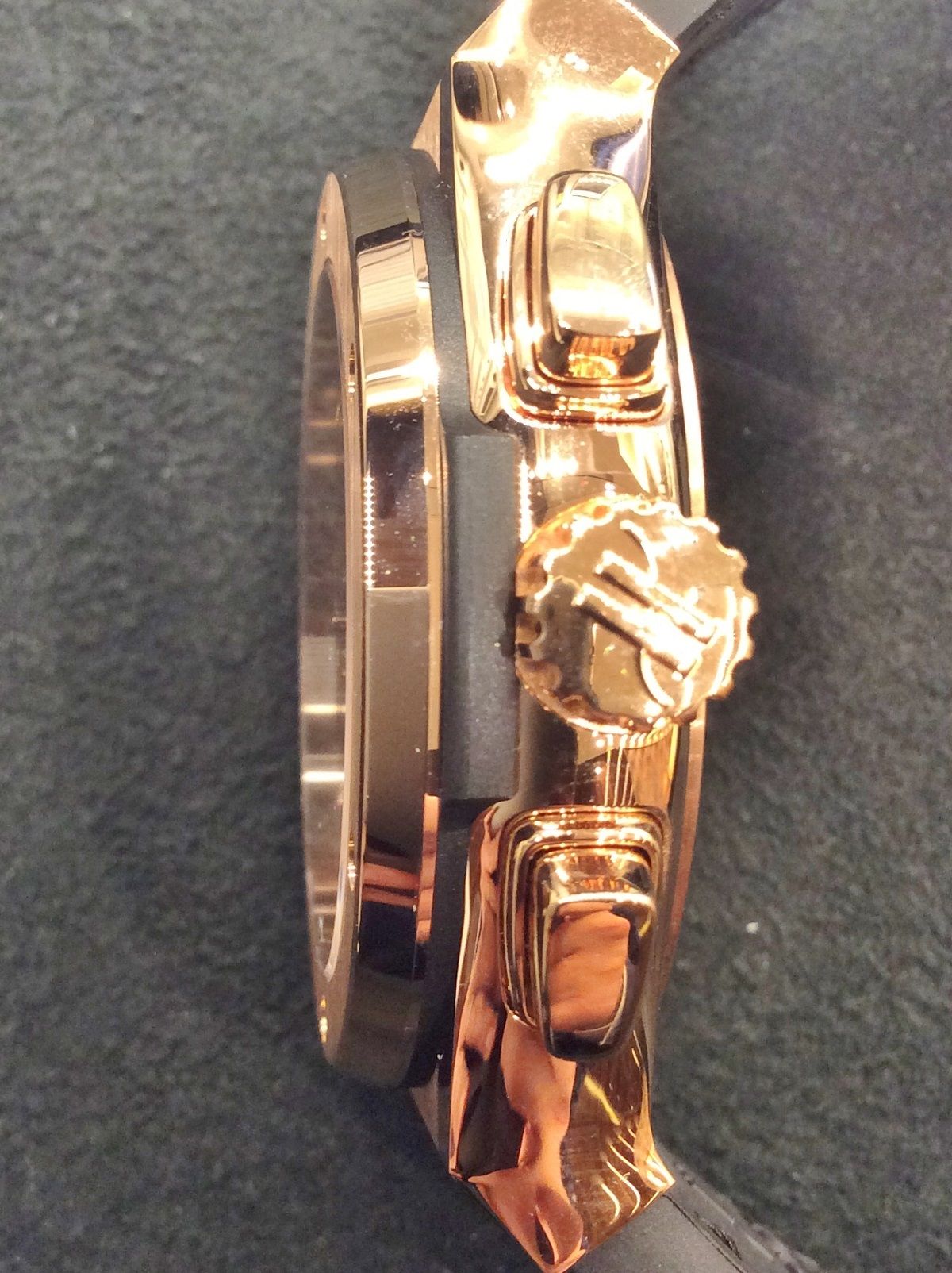 18金はステンレススチールなどに比べると、素材的に柔らかい為、加工には技術力がいりますが、ウブロでは写真にもありますように18金でも艶有り、艶無しをケースやプッシュボタンなどに用いることにより、高級感やカッコ良さがさらに増しています!!
