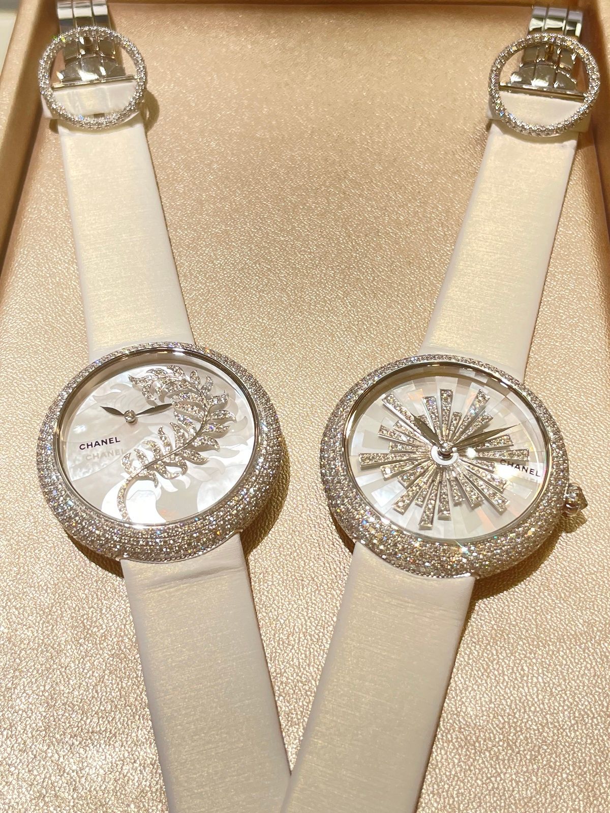 仕様:高精度クォーツムーブメント(左)、オートマティックムーブメント(右)、マザーオブパール(文字盤)、18Kホワイトゴールド(ケース)、ブリリアントカットダイヤモンド570個(ケース)、30m防水