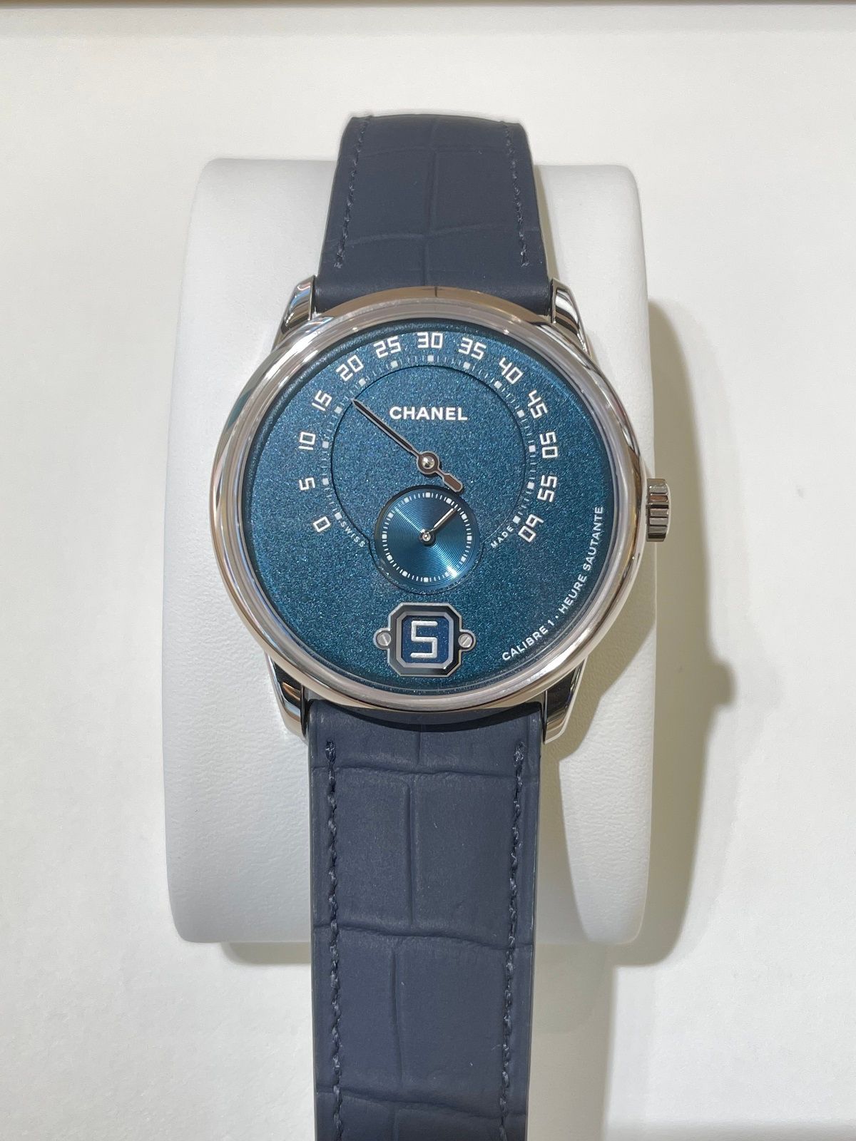 2016年にシャネルが男性の為にデザインし、作り上げたモデル。シンプルな文字盤からは想像できない動きをします。ジャンピングアワーと240度レトログラード分針が特徴です!