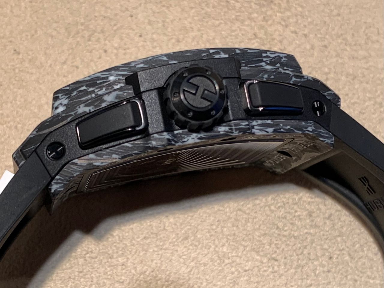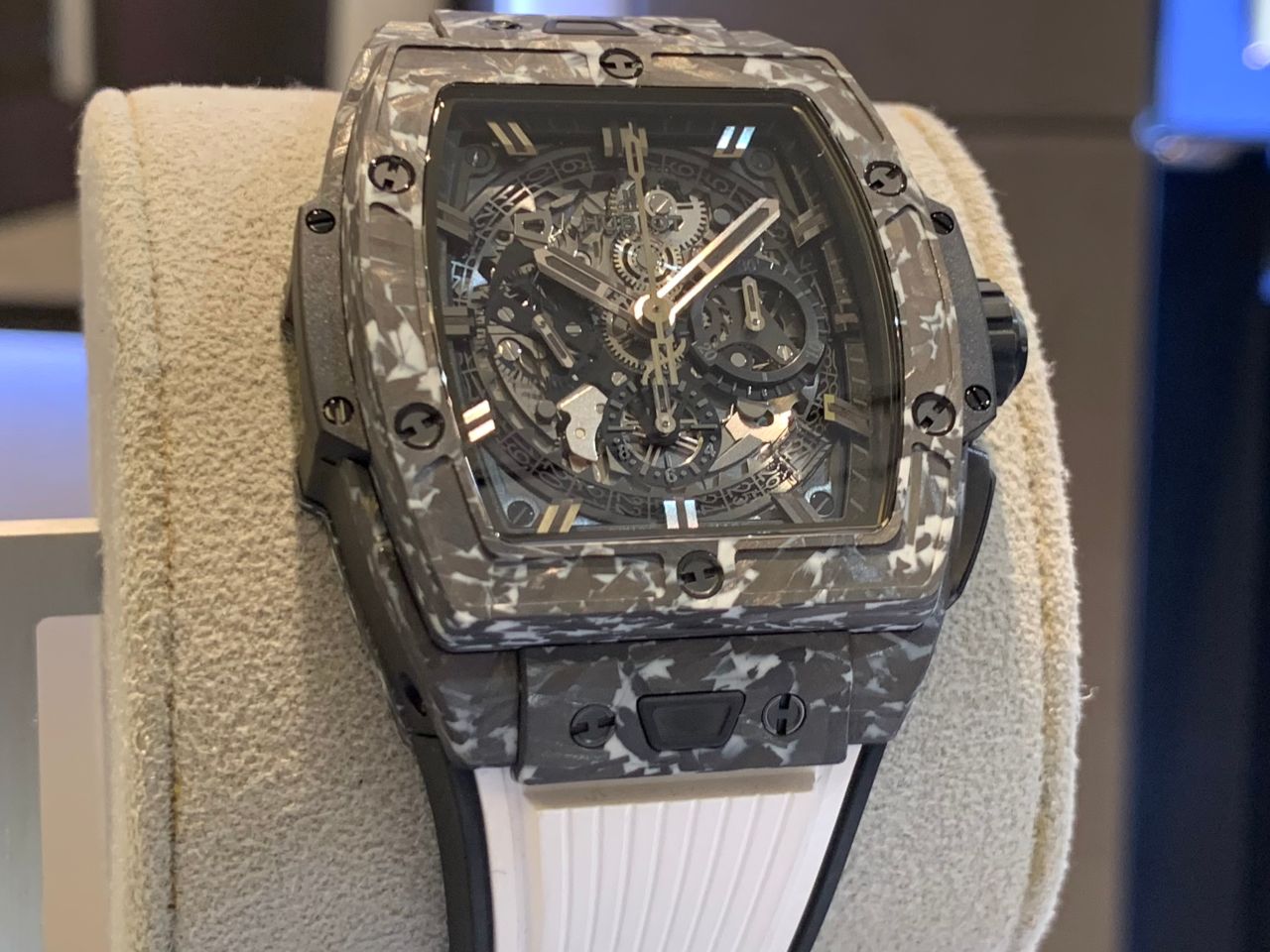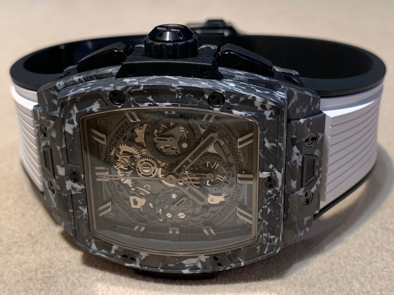 ブラックのカーボンケースにホワイトのラバーストラップを組み合わせたウブロらしい1本!